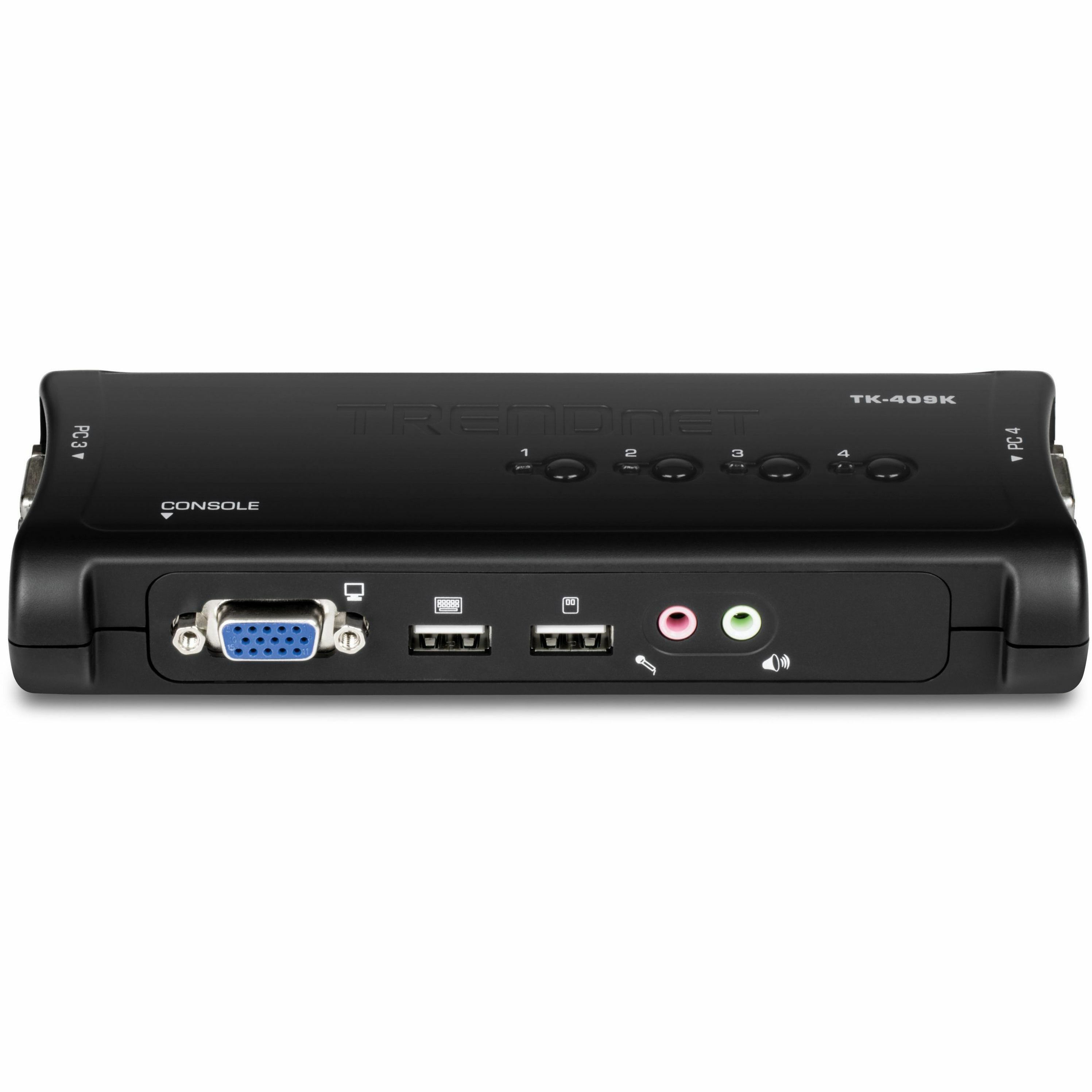 | Marketing Information | TRENDnet's 4-Port USB KVM Switch with Audio, model TK-409K, allows you to control four computers with one set of console controls. Experience up to 2048 x 1536 resolutions, no driver installation required. Separate sets of KVM cables are included with the KVM switch, so users can start controlling four workstations instantly. The KVM cables also provide power to the KVM switch, eliminating the need for a power adapter. Hot Key operations provide immediate access to features, such as computer switching, and auto-scanning. With its Hot-Plug and Audible Feedback, the 4-Port USB KVM Switch is the perfect choice for managing multiple PCs.