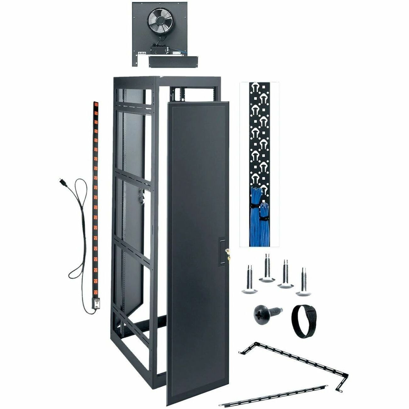 | Marketing Information | Specify MRK series when you need an enclosure built to perform like a workhorse. Its rugged, space-saving design and high seismic load rating make it a favorite of installing contractors, particularly on larger-scale multi-bay jobs. The MRK series also offers seismic certification and open or removable sides. Fully welded construction for strength. Racks gang together when fully loaded. Standard front and rear adjustable 10-32 threaded rack rail with numbered spaces. Includes standard configurable rear door and solid front door. Comes configured with integrated fan top, vent blockers, and rear door vent. Includes LACE-OP lacer strip, 4 straight and 2 offset lacer bars, 12 Velcro straps. Includes 20A, 20 outlet corded power strip (PDT-2020C-NS). Includes 10-32 threaded rack screws, 100 qty, and 4 leveling feet. Includes side panels. |