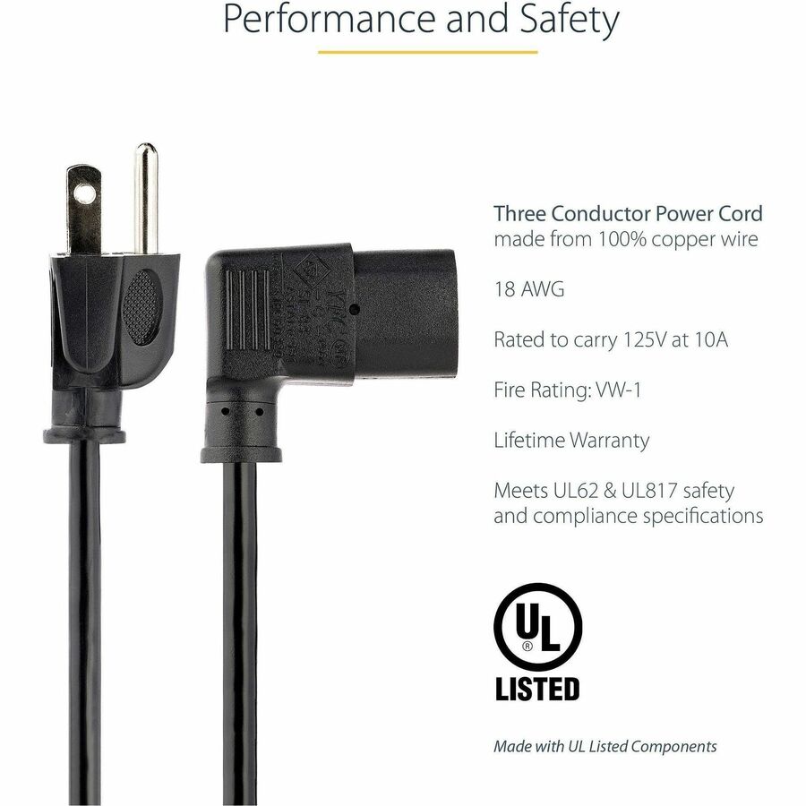 6ft (1.8m) 18AWG flexible computer power cord w/ NEMA 5-15P and Right-Angle IEC 60320 C13 connectors; Rated for 125V 10A; UL listed (UL62/UL817); Fully molded ends; 100% Copper Wire; Fire Rating: VW-1; Jacket Rating: SVT; Jacket Material: PVC