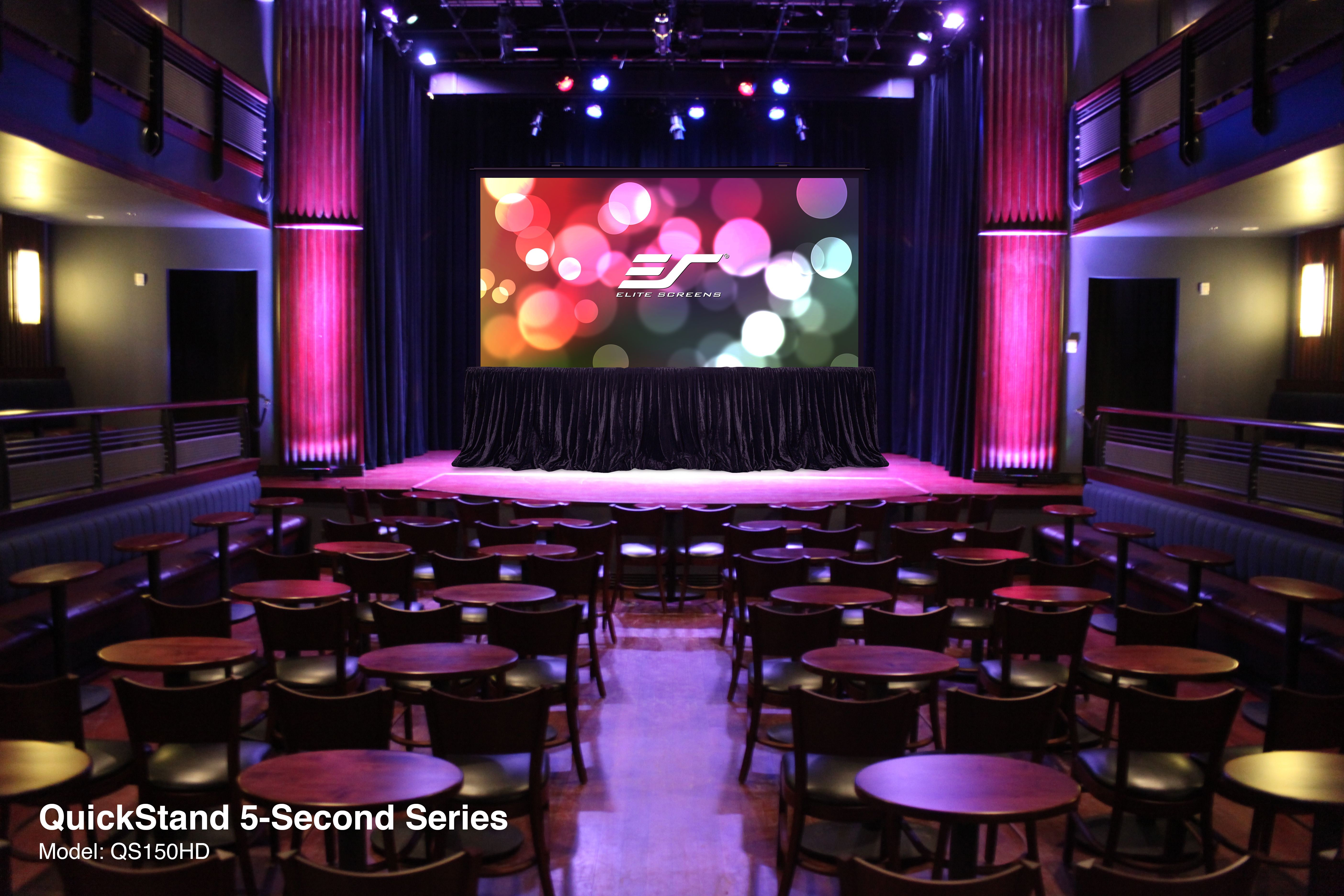 | Marketing Information | Elite Screens® QuickStand 5-Second series is designed to be the fastest, hassle-free, large venue projection. The QuickStand 5-Second series features Elite Screens® innovative dual cross-spring mechanism that allows for a full projection set-up in as little as 5 seconds! This series of screens arrives fully assembled within a heavy duty, travel, stage case that provides mobility with the built-in wheels, handle, and locking latches. The GreenGuard Gold certified, MaxWhite® Fiberglass screen material offers 180° viewing angle perfect to accommodate large audiences, and has fully black backing and masking to eliminate light penetration and projection overshot. Quick Stand 5-Second series also features an elegant black velvet drape kit that attaches to the base of the screen for a more professional appearance that helps in eliminating background distractions while enhancing the screens overall aesthetics. This series combines the speed and professionalism with a sturdy construction for the rigors of repeated presentations all within one convenient package, making it the ideal choice for your professional Audio/Video and stage needs. Since 2004, Elite Screens® has become a global leader in projection screen manufacturing through its headquarters in the US and branch offices in Europe, Japan, Australia, India, Taiwan, and China. With a focus on superior product and service, Elite Screens® is dedicated to making projection screens for any projection environment. Ask about Elite's 2-year warranty and 3-year ENR-G enhanced warranty. |