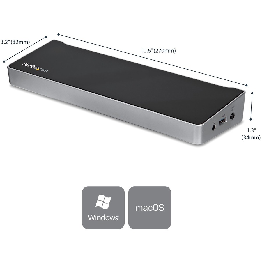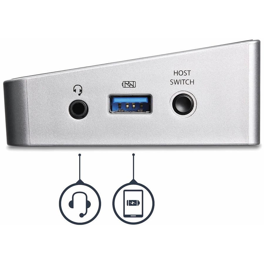 Transfer Files Between Your Laptops Instead of transferring files to the cloud or external storage, the docking station lets you quickly and securely transfer data between your docked laptops, using Windows Easy Transfer or the included PCLinq software. Fast-Charge Your Mobile Devices The USB 3.0 dock's always-on USB fast-charge port lets you charge your tablets and other mobile devices, even if your laptops aren't docked. Convenient Display Options This USB docking station gives you the option to connect a single 4K display instead of dual displays. Set your laptop workstation up with dual monitors (1x DisplayPort, 1x HDMI), or for higher resolutions, connect either a single HDMI or 4K DisplayPort monitor. Maximum Supported Resolutions* Video Output Configuration Max DisplayPort Resolution Max HDMI Resolution DisplayPort and HDMI (Two Displays) 2048 x 1152p 2048 x 1152p DisplayPort (Single Display) 3840 x 2160p (4K) N/A HDMI (Single Display) N/A 2560 x 1440p*Lower resolutions are also supported. For example, if the max is 3840 x 2160p (4K), it also supports 2560 x 1600p and 2560 x 1440p. Easy Installation, Simple Switching Compatible with Mac and Windows® USB 3.0 equipped laptops, the KVM docking station includes two USB 3.0 cables for quick installation and features an easy-access button for easy switching between laptops. StarTech.com laptop docking stations offer cost savings and faster deployment with just a single cable. This USB 3.0 Docking Station is backed by a competitive 3-year warranty and free lifetime Technical Support. More from the Manufacturer |