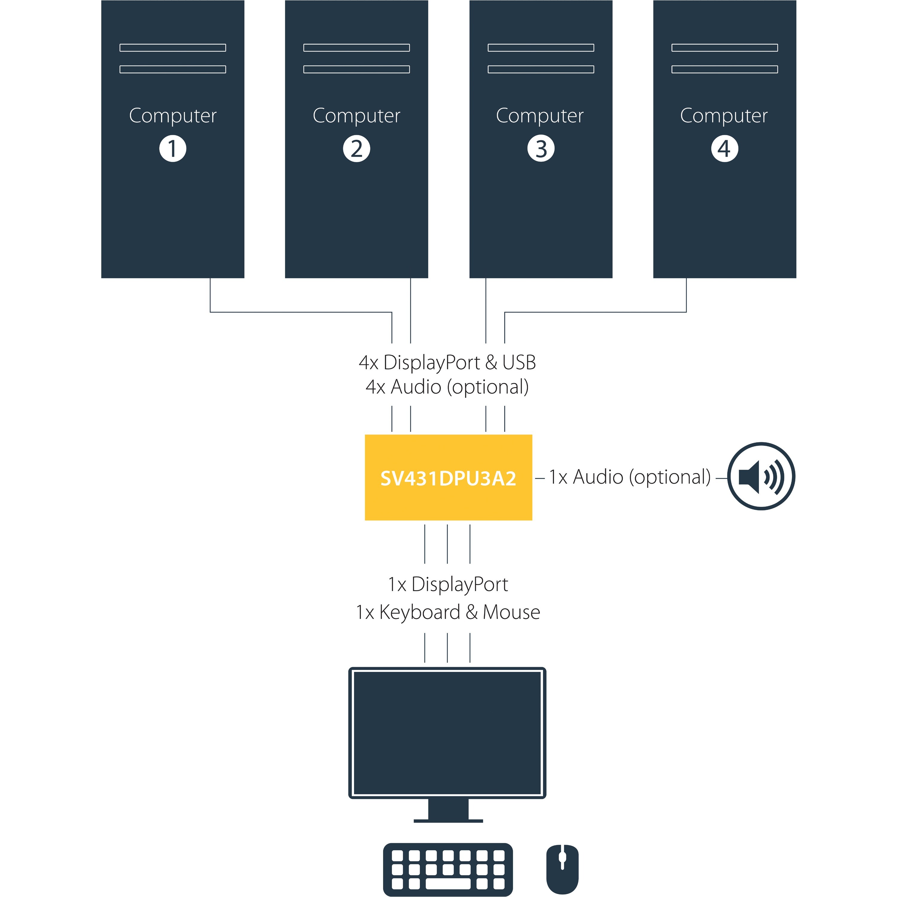 | Marketing Information | This4-Port USB 3.0 DisplayPortKVM switch lets you control four DisplayPort (DP) computers with a single monitor, keyboard andmouse. The KVM also features 3.5 mm audio and abuilt-in 3-port USB 3.0 hub. Convenient and cost-effective USB 3.0 peripheral sharing This KVM switch offers a built-in3-port USB 3.0 hub that's separate from your HID keyboard and mouse, so you can share USB peripheral devices between each connectedcomputer and avoid the expense of separate equipment. The USB 3.0hub automatically switches your connected USB devices to the selected computer, saving you the hassle ofdisconnectingand reconnecting your peripherals. With support for USB 3.0, you can achieve datatransferrates up to 5Gbps, toensureflawless performance for your USB peripherals - great for quickly transferring data to external USB 3.0 drives. Astonishing picture quality Offering support for resolutions up toUltra HD 4K at 30 Hz, this 4-port DisplayPortKVM switch has the ability to drive large DPdisplayswith ease, making it ideal for graphical applications that require high-resolutionvideo support. Complete multimedia control The KVM switch features auxiliary 3.5 mm audio ports thatenableyou to share independent analog audio, from each of your connected computers,with yourdesktop speaker set. Independent audio,along with 4K DPvideo, givesyou full multimediacontrol between different computers, making this KVM perfect for creative professional applications such as video and sound design orediting. The SV431DPU3A2 is TAA compliant and backed by a StarTech.com 2-year warranty with free lifetime technical support. Rackmount your KVM switch If you'd like to mount this KVM switch to your server rack, StarTech.com offers a 1U Rackmount Bracket(sold separately) that turns this KVM into a rackmountable KVM. More from the Manufacturer |