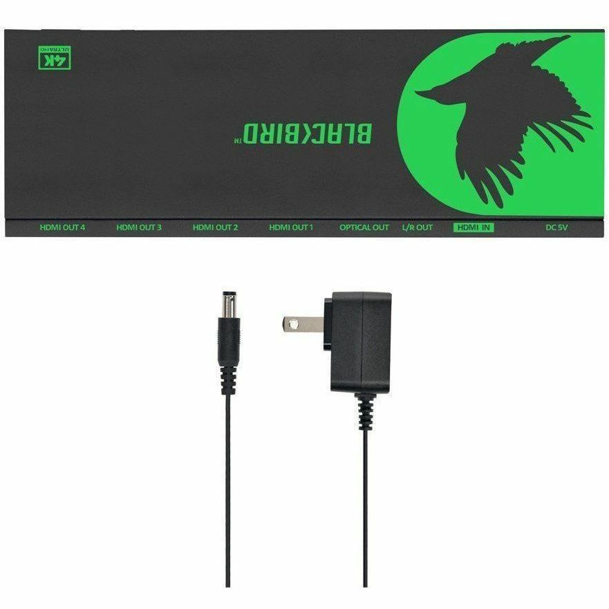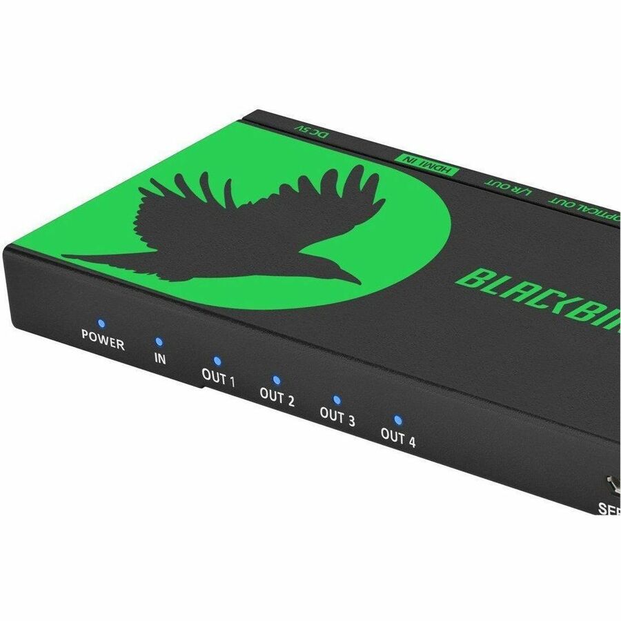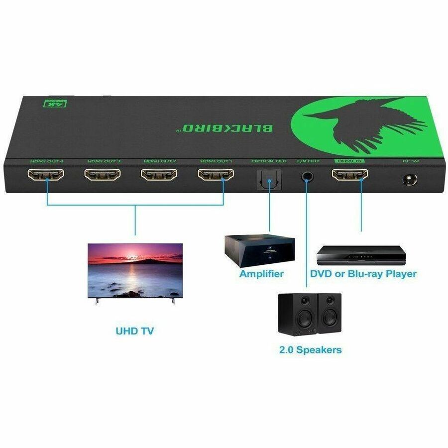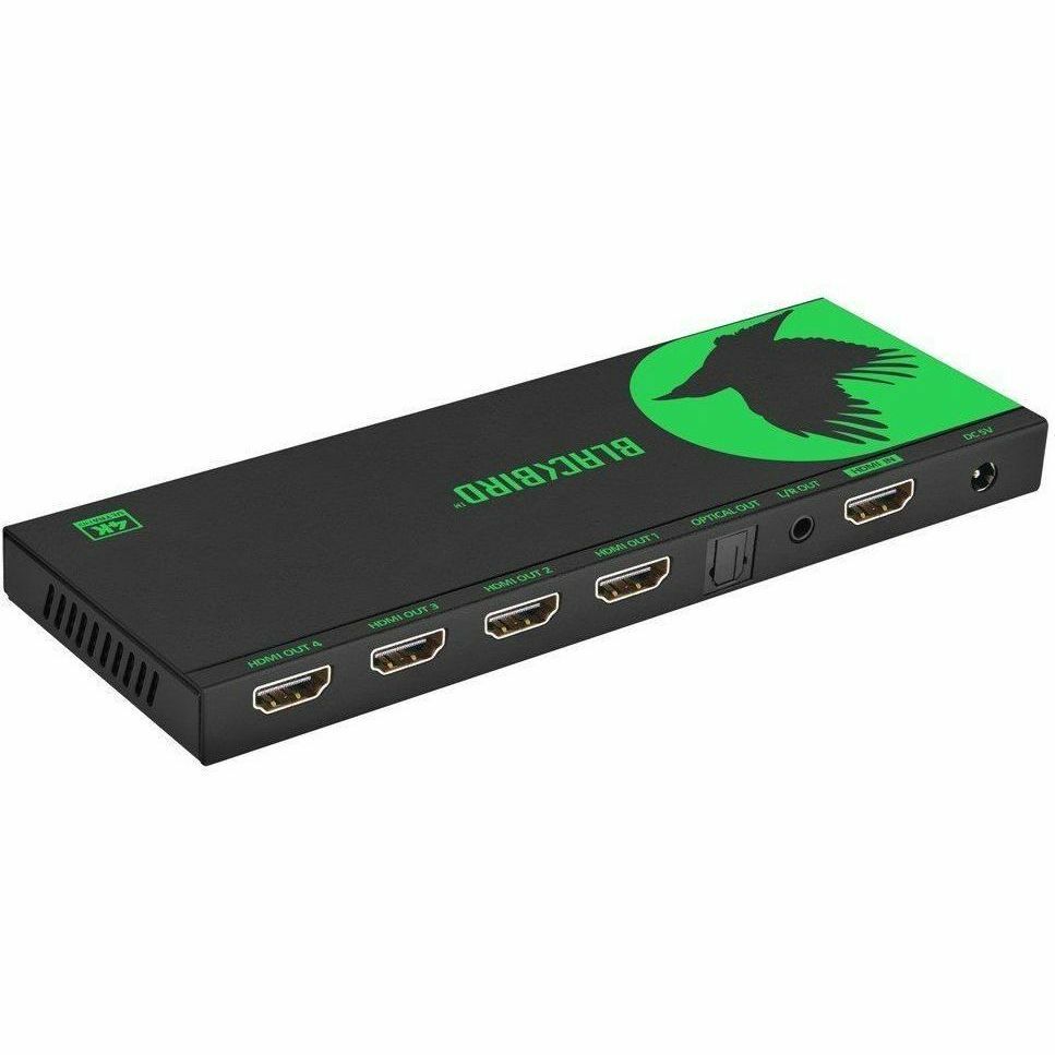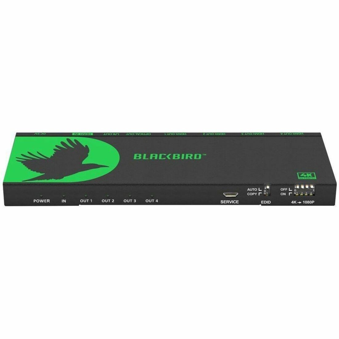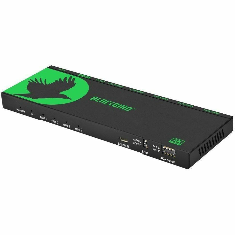 | Marketing Information | This 1x4 HDMI Splitter allows you to distribute a single HDMI source to four displays. It supports video resolutions up to 4K@60Hz (4:4:4) and complies with the HDMI 2.0b and HDCP 2.2 standards. It features EDID Auto and Copy functions, can downscale a 4K video signal to 1080p, and can extract the audio to digital optical and stereo analog outputs. Use this powerful splitter to send 4K video signals to both 4K and 1080p displays at the same time. Unlike most other HDMI splitter, this Blackbird scaling unit ensures that you get the best performance from any connected display. - Supports Video Resolutions Up to 4K@60Hz (4:4:4)