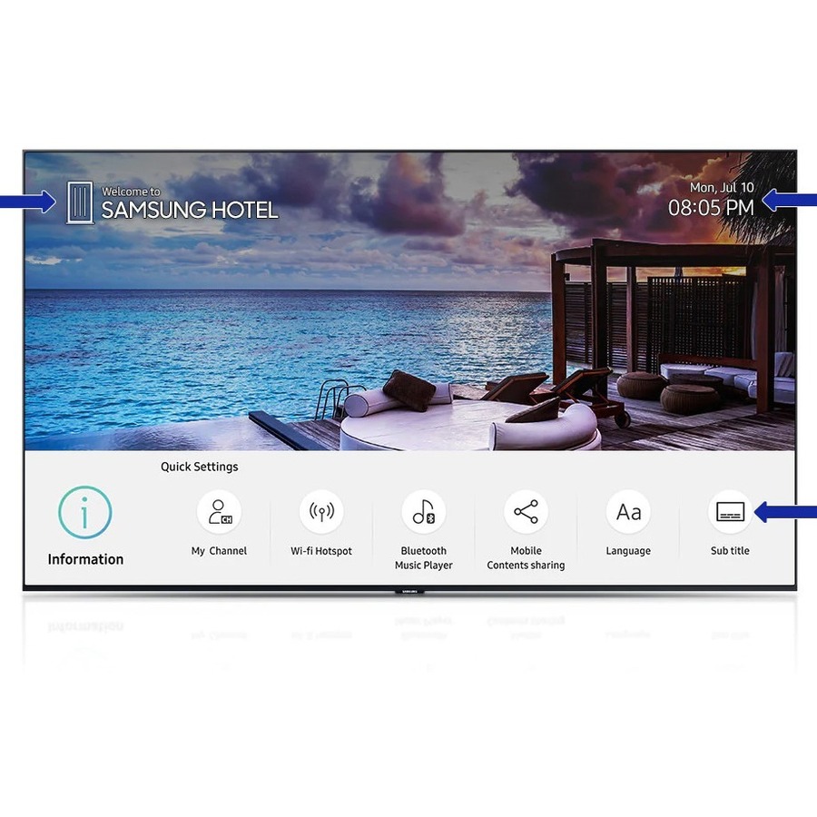 | Marketing Information | Create a premium guest experience Samsung's HT690U displays enable premium hotel operators to meet guests' rising expectations while improving their own efficiency. Through brilliant UHD picture quality and convenient room management, guests can enjoy the comforts of home and seamless two-way communication through their display. Crisp and vivid colour expression Crystal Display ensures optimized colour expression so guests can experience every subtle detail, immersing themselves in any content with a wider range of colours. UHD-quality content delivery Samsung's hospitality displays offer hotel guests the vivid picture quality of home entertainment systems. Through UHD upscaling technology, these refined displays showcase all content at UHD resolution (3,840 x 2,160), with four times the pixels of the FHD standard. Refined picture quality Beyond consistent UHD quality, Samsung's displays bring the power of High Dynamic Range (HDR10+) picture refinement to any hotel room. Using dynamic metadata that fine-tunes each frame within a given program, HDR10+ technology delivers an optimal, detail-rich and memorable viewing experience. A tailored home menu Each Samsung hospitality display includes an intuitive, customizable home menu that streamlines content exchange between hotels and guests. Content managers can easily incorporate images, logos and feature icons specific to guest needs while reinforcing special offers and hotel branding. Powerful performance, enhanced security Backed by the powerful TIZEN operating system, Samsung hospitality displays ensure secure content delivery across the application, platform and system layers. Simple, compatible web app development Beyond its advanced graphics capabilities, Samsung's H.Browser empowers smooth application development. All apps can be stored within the TIZEN OS and are supported by Web Simulator and Remote Web Inspector tools that further refine app performance and security. Centralized, real-time management Compatible with existing LAN, Wi-Fi and coaxial infrastructures, Samsung's LYNK REACH 4.0 content platform centralizes and streamlines overall hotel maintenance. Hotel managers now can remedy issues across single displays or display groups before they escalate. End-to-end personalized service Hotels additionally can use LYNK REACH 4.0 to deliver customized guest messaging. Upon arrival, guests can receive a personalized greeting along with information about promotions or on-site amenities relevant to their stay. LYNK REACH 4.0 also provides express check-out for added convenience. |