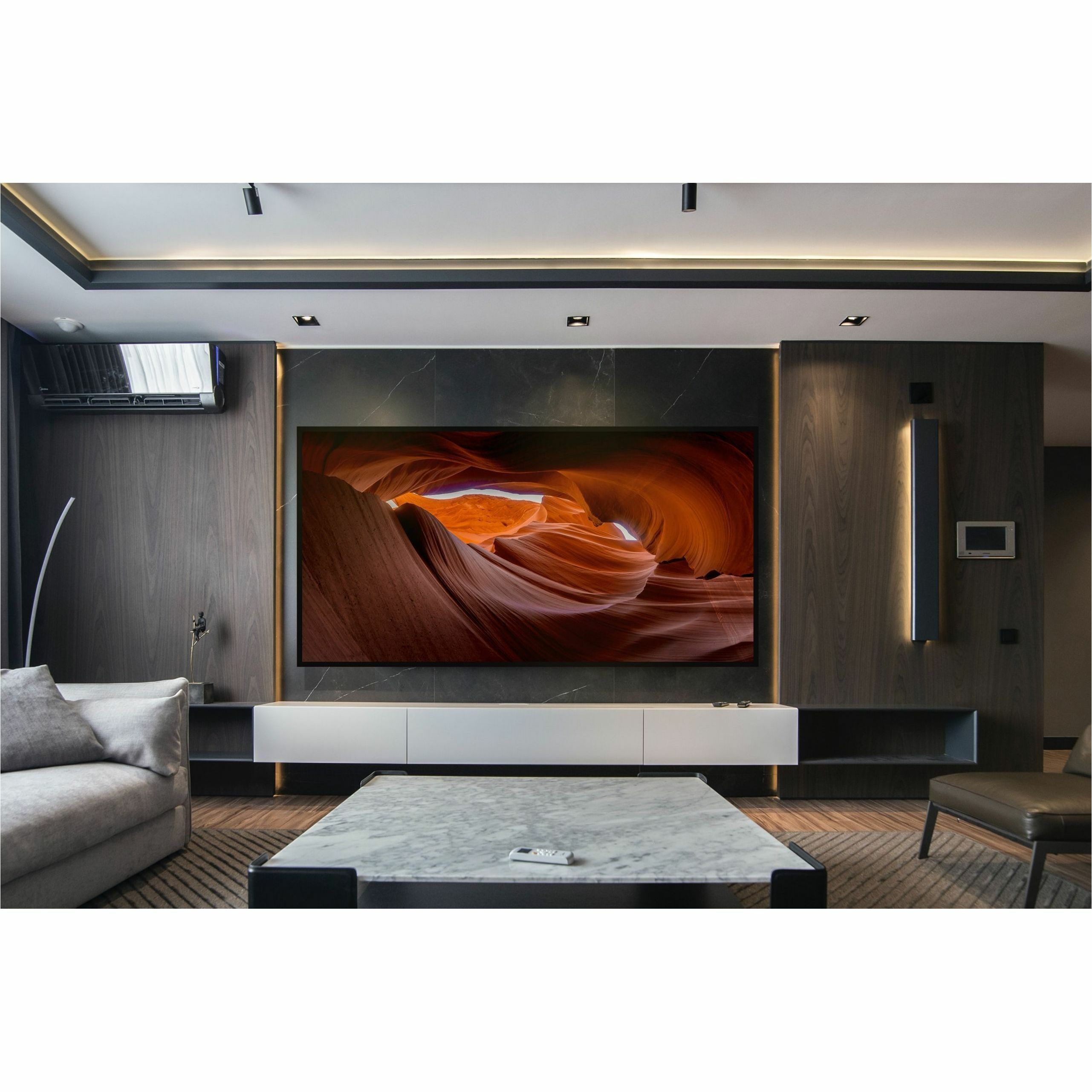 | Marketing Information | AudioWeave EVO 8K Slim Frame Screen No compromise. Choose AudioWeave for Superior Audio Transparency With perforations less than 0.05" in diameter (1.27mm) and only 36 holes per square inch, physics simply dictates that frequencies above 1000Hz face nearly no attenuation. Sound passes through our AudioWeave technology with zero audio quality loss. Mind-Blowing Audio Performance with Exceptional Image Clarity Our specially engineered woven screen material allows content to be projected with near perfect pixel accuracy. This means you'll enjoy bright and clear images, with better contrasts and more vivid colors, without losing out on sound quality. Material Orientation Eliminates the Moiré Effect When the screen material aligns with the grid pattern of the projector, the moiré effect occurs ruining the image quality. Lower quality screens are plagued with this issue, but with our signature AudioWeave technology, the material is woven in a way that it will never align with the grid, and will always provide you with a stunning image. Acoustically Transparent for a Truly Immersive Experience After years of research we've engineered a material that allows a complete transparency of all audio frequencies passing through, exactly as they came out of the speakers. Your screen will not distort the sound quality while still delivering reference image projection. Complete audio transparency means that you can hide the speakers behind the screen and without any compromise in quality. Plush ¾" Velour Wrapped Aluminum Frames The aerospace-grade aluminum construction, in combination with the dual frame structure, means that the screen will not bend or bow under any circumstances. The 3/4" frame is wrapped in high-density black velour that has been selected for its ability to completely absorb any excess light. The Perfect Canvas for your Content Make an impression on your guests with the ultimate projection screen that perfectly showcases both audio and video. Whether you're showing the latest blockbuster or a cinema classic, screen your movies in the best way possible. Impressing your guests and enthralling your audience. |