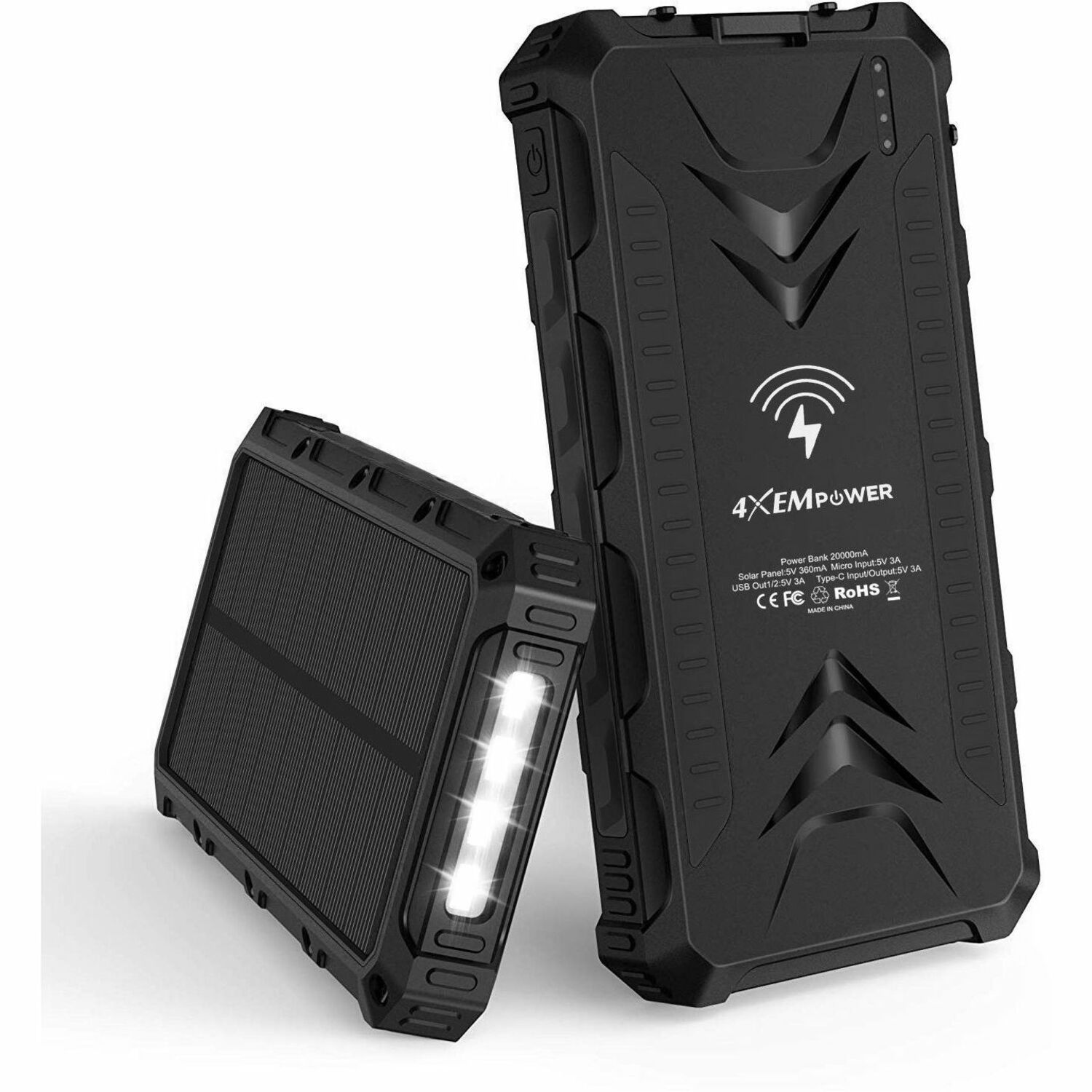 | Marketing Information | Never worry about running out of battery power again with the 4XEM 20,000mAh Mobile Solar Power Bank and Charger. This cutting-edge device is designed to keep your devices powered up and ready for action, no matter where you are. With a sleek and compact design, it's the perfect companion for outdoor adventures, travel, emergencies, or simply staying connected on the go. Equipped with a 20,000mAh rechargeable lithium-ion battery, this power bank provides ample power to charge your smartphones, tablets, cameras, and other USB-compatible devices multiple times. The 4XEM Power Bank features a USB Type-C port, two USB Type-A ports, and a Qi-compliant wireless charging coil, giving you the flexibility to charge multiple devices simultaneously. It's a true powerhouse in the palm of your hand. Harness the power of the sun with the built-in solar panel. Simply place the power bank under sunlight and let it charge itself. It's an eco-friendly and convenient way to top up your power bank when you're outdoors or in areas with limited access to electricity. It is waterproof (IP54), dustproof, and shockproof, ensuring reliable performance even in challenging environments. Plus, the power bank doubles as a handy 4-LED flashlight with SOS and caution modes, providing illumination and safety when you need it most. Stay powered up and connected with the 4XEM 20,000mAh Mobile Solar Power Bank and Charger. Don't let a dead battery slow you down-get yours today and experience the freedom of unlimited power! Benefits:
