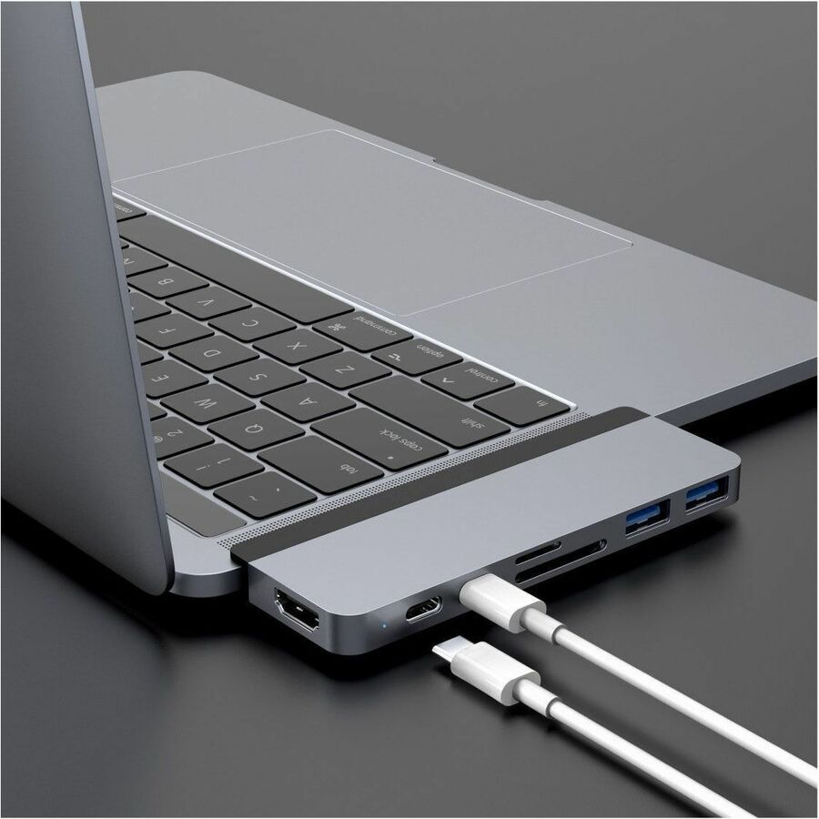 | Marketing Information | Form-fitting USB-C Hub for MacBook Pro and MacBook Air. This USB-C docking station securely attaches to MacBook adding 7 ports: 4K 60Hz HDMI output, USB-C PD, Thunderbolt 3 compatible, and more. Most Crowdfunded MacBook Accessory | New and Improved The world's most crowdfunded ($3.1M) MacBook accessory is now even better with a new removable magnetic grip and 4K60Hz HDMI support. Now supporting 4K60Hz HDMI | 7 Ports including Dual 4K60Hz Video HyperDrive Duo can now support two 4K60Hz video displays via HDMI and USB-C 40Gbps 100W PD port. Other ports include USB-C 10Gbps 60W PD (only HyperDrive has two USB-C ports with Power Delivery), MicroSD/SD, and 2 x USB-A. Patented | Magnetic Grip for more secure fit Easily removable magnetic grip secures HyperDrive DUO onto MacBook Pro/Air for better connection under any situation. Remove magnetic grip | MacBook Case Compatible Remove magnetic grip to connect HyperDrive Duo to MacBook Pro/Air with cases. Free USB-C extension cable | Use with any device Included USB-C extension cable allows the HyperDrive DUO to work with any single port USB-C device. |
