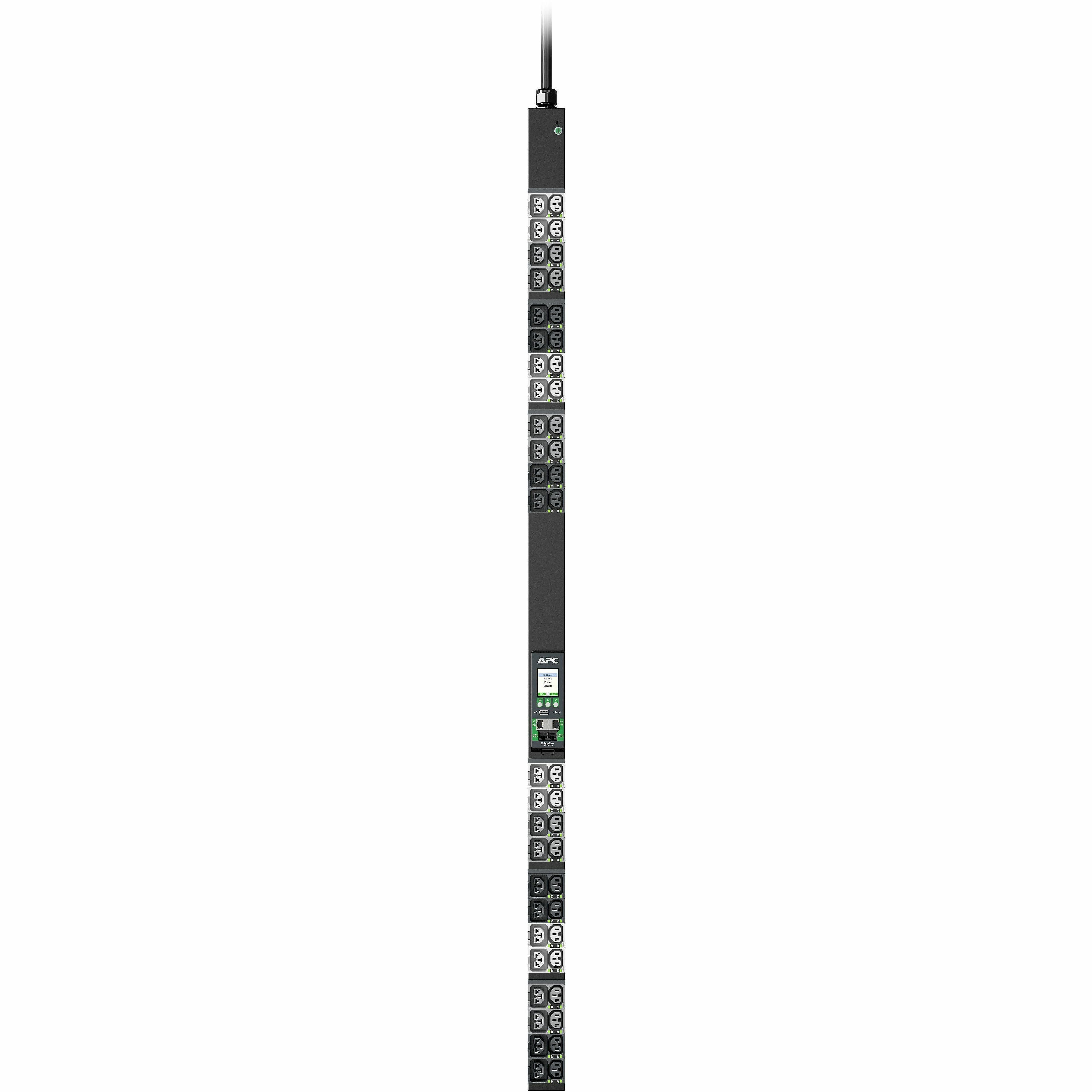 APC NetShelter Rack PDU Advanced provide reliable power distribution to IT Equipment within server and/or networking racks. PDU level power metering via remote access and local display for power visibility and notification of potential overload. 4-in-1 combination outlets which can be used as either C13, C19, C15, or C21 outlets provide unparalleled deployment flexibility. Maximum outlet density with 42 outlets in a 2.2" wide form factor. Outlets on the PDUs are color coded and/or labeled by breaker and input phase on 3 phase models to simplify deployment. Provides an alternating phase design whereby each of the 3 phases are organized into small outlet groups which alternate from top to bottom of the PDU to facilitate better power cord management and promote better load balancing. Power Sharing allows PDUs cascaded together via 2 ethernet ports enable an Network Management Card to continue functioning in the event of an AC power loss. No interruption in Network communication, sensors operation, and alarm traps. Live Swap Network Management Card (NMC) which can be replaced without powering down the PDU or connected devices to minimize downtime in the unlikely event of an NMC power event. Rated and approved to operate up to 60C (140F) at full load ensures reliability and availability even in today's high density deployments. Gigabit ethernet to enhance and standardize network connectivity across all assets in the data center. A second ethernet port (10/100) is available to allow cascading to other PDUs, connect to a 2nd private network, or provide network redundancy. 1% metering accuracy for the peace of mind to use NetShelter Rack PDU Advanced to bill based on power usage. In addition, the higher level of accuracy ensures the most precise measures for capacity planning and threshold alarm monitoring. Two environmental sensor ports allow for optional sensors (sold separately) to be connected. For data center deployments across multiple regions, these PDUs are both UL and CE rated providing one PDU that can be used globally to simplify and standardize deployment.