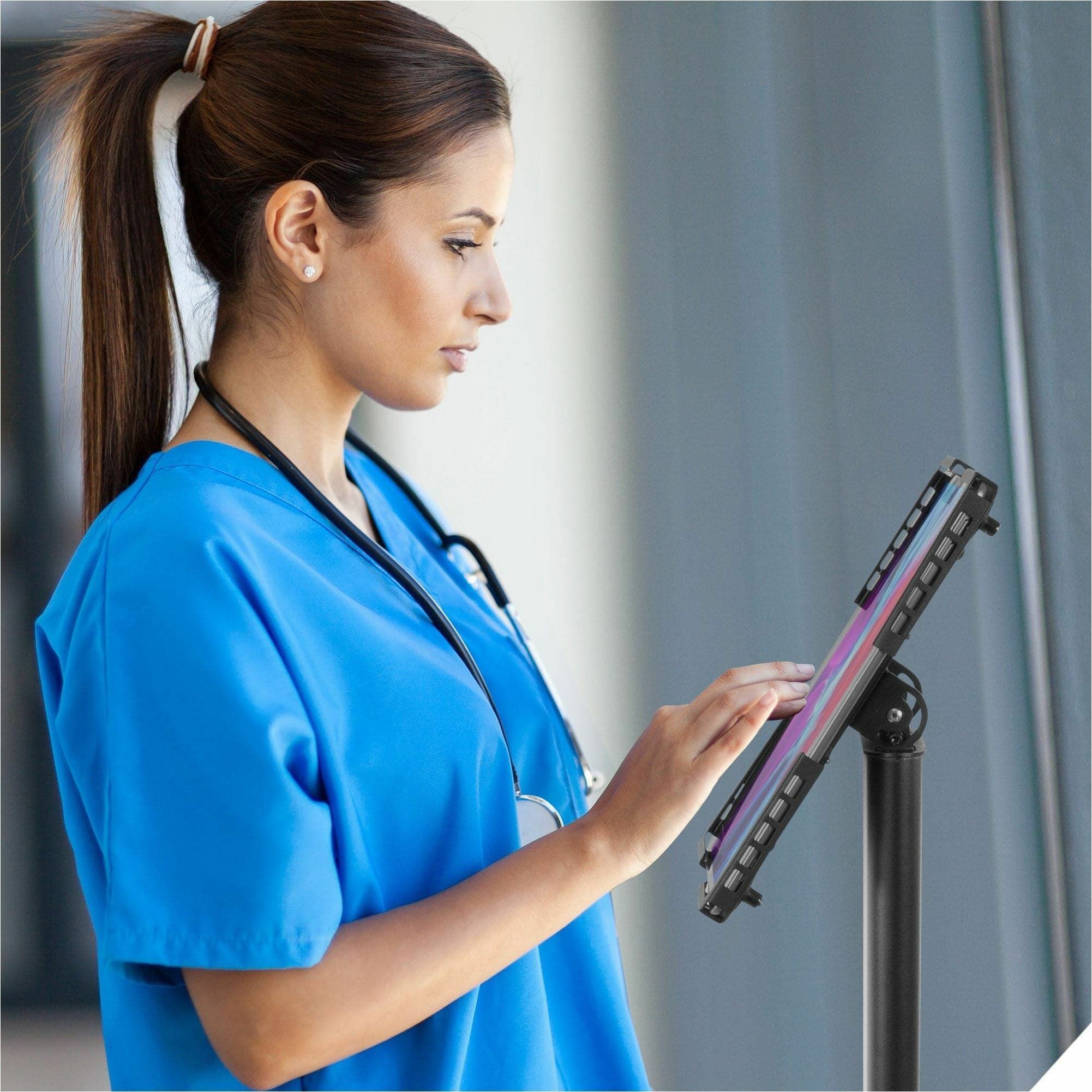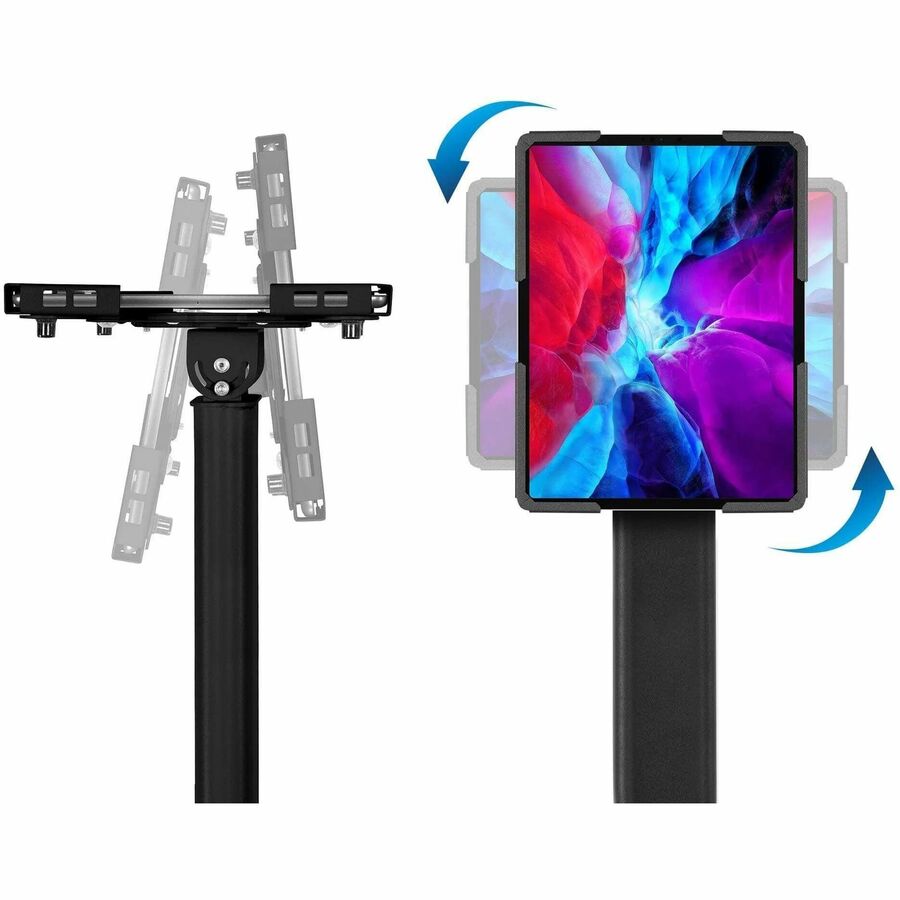 | Marketing Information | Stand out and increase engagement with this freestanding universal tablet kiosk that allows you to interact with your customers, visitors, or clientele in a fun, modern way. The minimalist locking tablet enclosure will speed up the checkout process, increase shopper engagement, loyalty sign-ups, and guest registration. A retail inspired iPad stand highlighted by the tilting and rotating theft-deterrent tablet holder, has a cable management access port within the pole to hide wires and cords from view and keep your tablet charged when mounted. The security frame ensures your tablet is safe when on display and protected from theft. The wide stand base allows it to be used freestanding or for added security can be bolted to the counter-top. Buy with confidence. Made from high grade materials with a matte finish, this tablet stand and wall mount is perfect for any setting. |