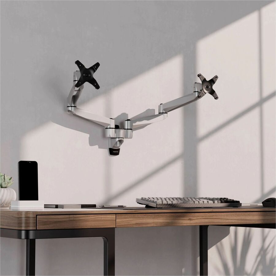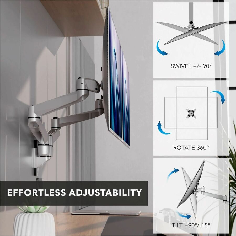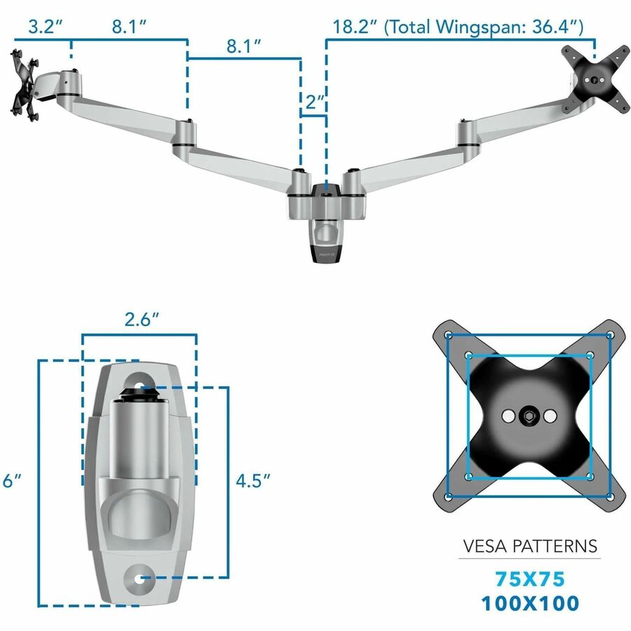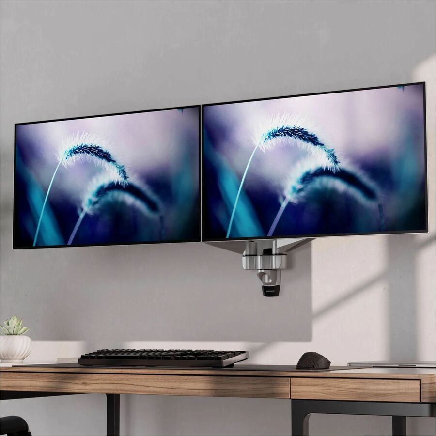 Overview Optimize your workspace with our CLiX dual monitor wall mount, designed to support two screens up to 34 inches and 22 lbs each. Ideal for a wide array of monitors, this mount enhances visual comfort with swivel and tilt features, allowing for perfect screen positioning. Its space-saving design offers flexible wall installation, making it an excellent choice for corporate offices, healthcare environments, gaming or any area where desk space is limited. The mount supports screen rotation in both landscape and portrait modes, providing versatile viewing options that are suitable for a variety of tasks-from data analysis to graphic design. Quick-connect joints ensure easy and hassle-free assembly, saving time during setup. This robust mount is VESA 75x75 and 100x100 compatible and TAA compliant, meeting government procurement standards. Available in black and silver finishes, it not only enhances functionality but also complements any office décor. |