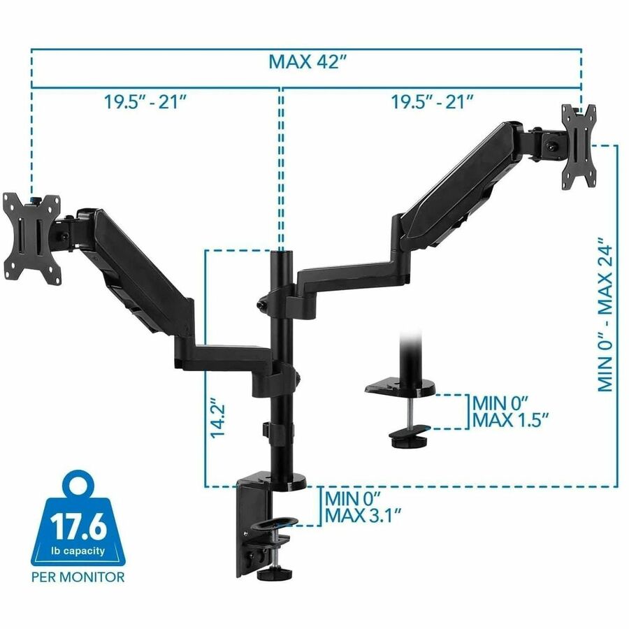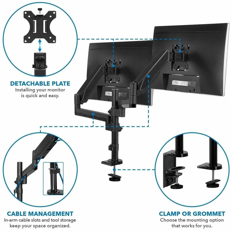| Marketing Information | MI-4762 is made for durability and includes both clamp and grommet installation options. The gas springs allow for smooth and easy height adjustments, and each arm can be adjusted independently. Tilt, swivel, rotate, raise and lower your monitors for comfortable reading, working, or gaming, while the integrated cable management keeps wires out of sight. |