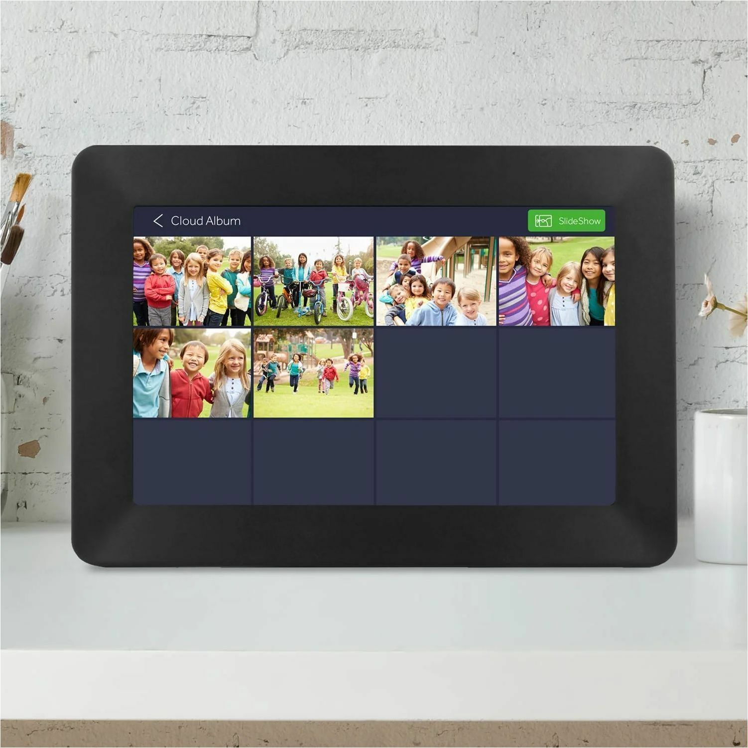 Enjoy photos and videos in slideshow mode set to background music. Features integrated speakers and built-in clock, calendar, weather, and alarm functionality. Store files easily to the frame's 8GB built-in memory.