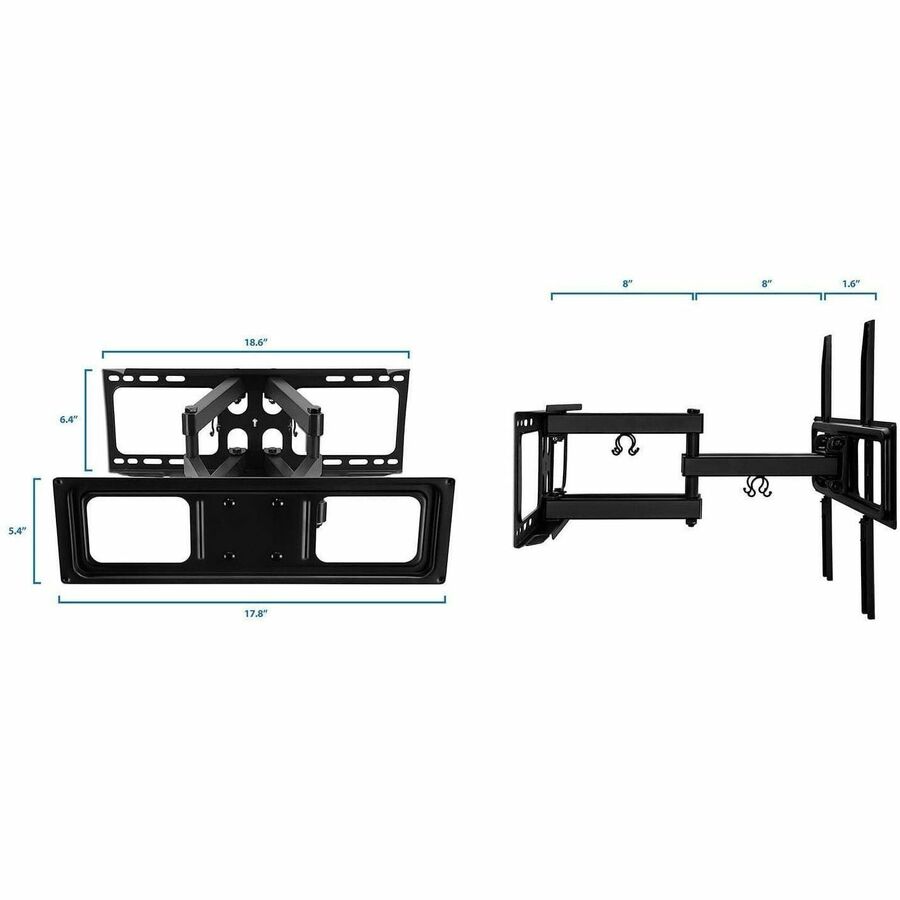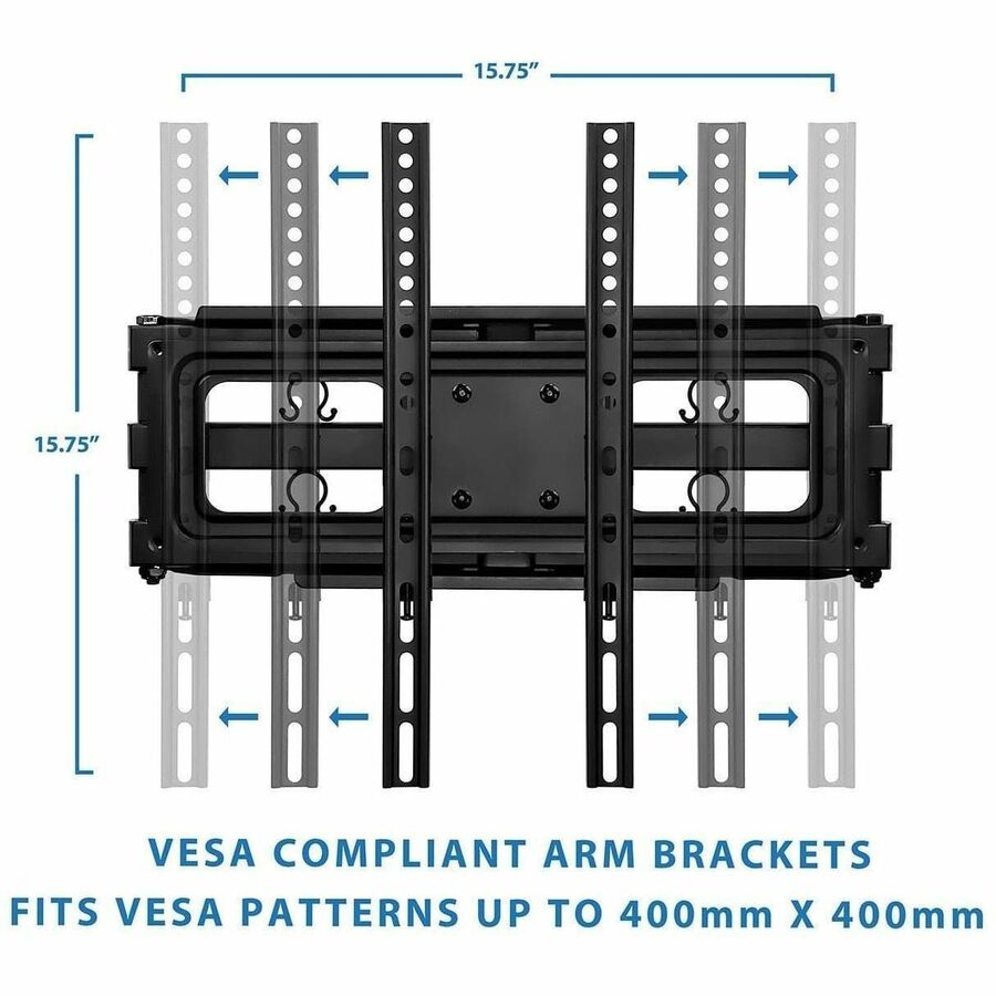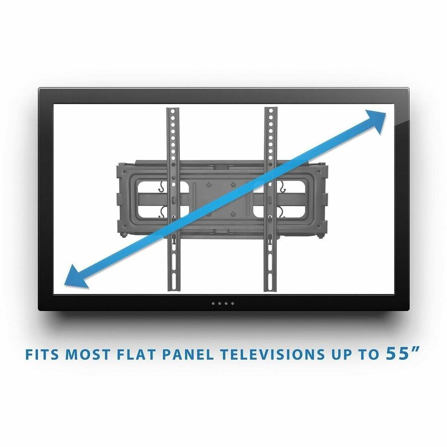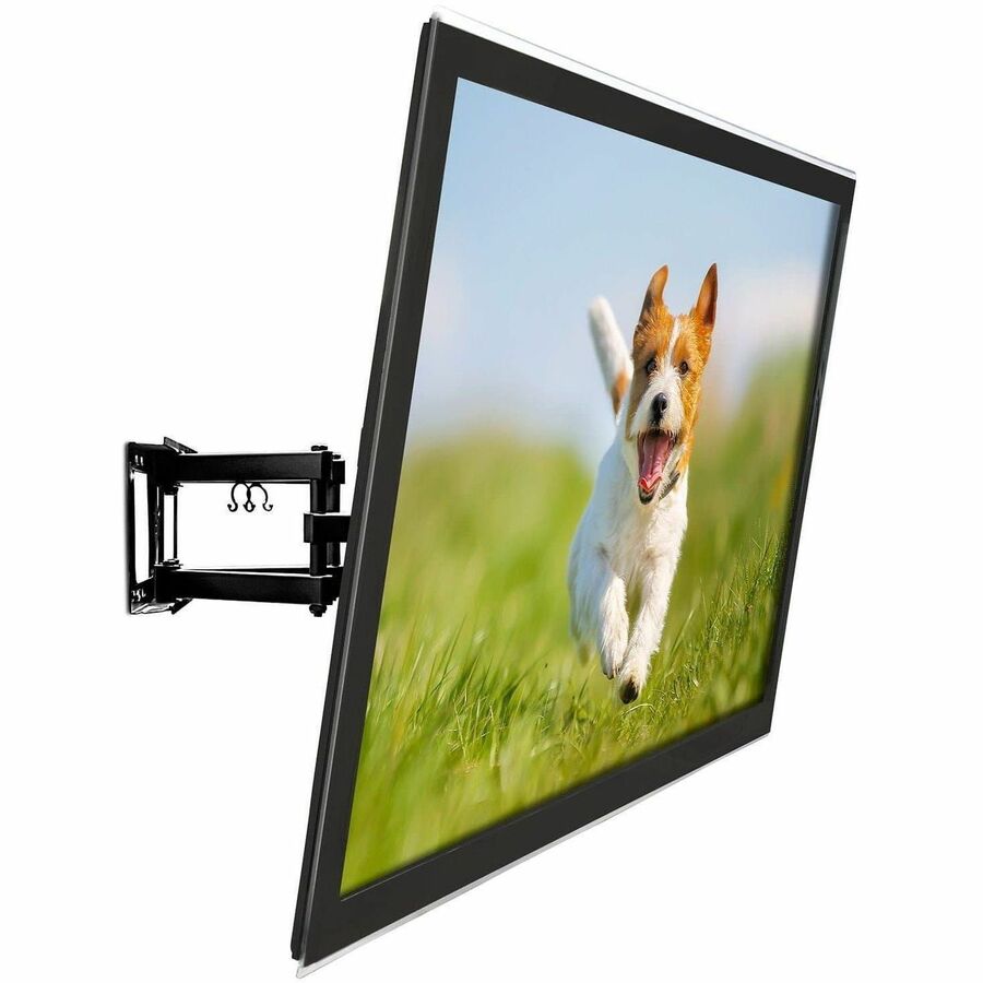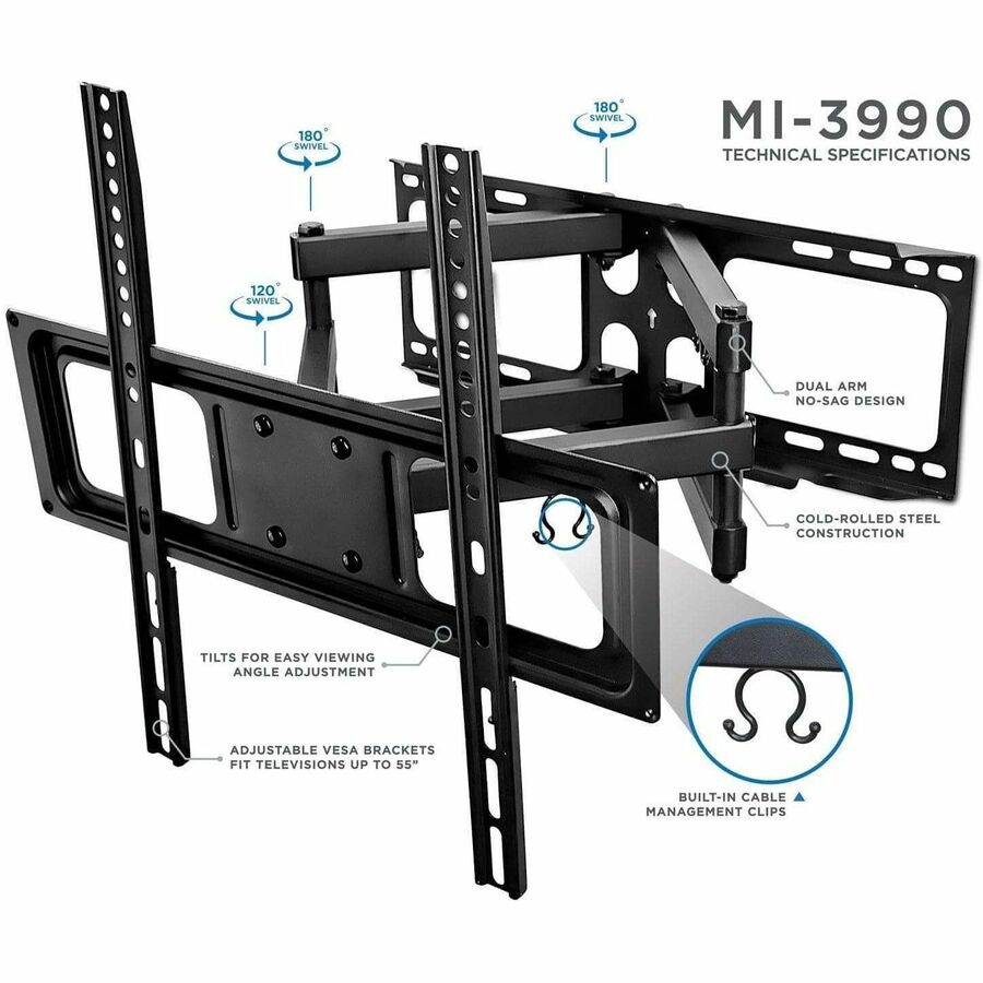 The MI-3990 dual arm wall mount can extends out 18.3" from the wall to suit any seating arrangement. Further, customize your viewing experience by tilting & swiveling to get a perfect position. Adjusting the angle is quick and easy. The dual swivel arms increase the sturdiness of the design and the heavy-duty construction can support up to 88 pounds, so you can rest assured that your screen will be safe and sound once it's installed. Cable management clips keep cables from your DVD player, cable box, or streaming device to the TV organized.