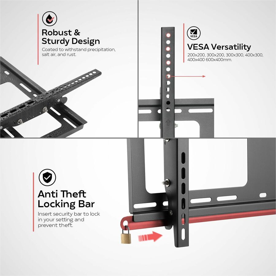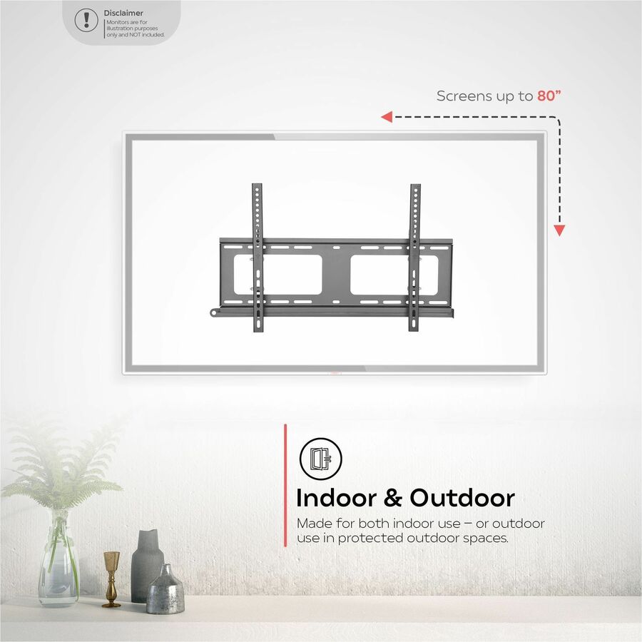 | Marketing Information | This sturdy VESA Mount Stand is an ideal solution for mounting monitors and digital signage both indoors and in protected (covered) outdoor spaces - like patios, retail pavilions and porticos, and anywhere else requiring screens. The stand itself is both electroplated and powder coated to withstand precipitation, salt air, and rust. It easily attaches to walls via the included hardware kit, and can be used with any VESA-compatible TV or monitor. Easy to assemble and very convenient, this mount stand holds TV's up to 80" max. Once installed, this stand allows leveling adjustment and this mount tilts and tilts 15-degrees for optimum viewing angles and glare reduction. The stand comes complete with a slide-enabled lock, ready for use with padlock and key (not included). - Robust, sturdy design supports TVs or digital signage