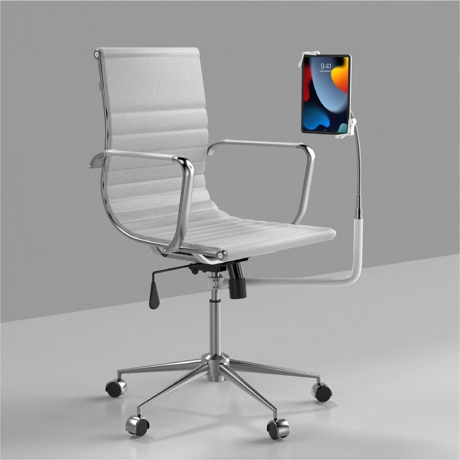 | Marketing Information | This rugged chair mount is ideal for medical waiting rooms, airports, hotel lobbies, check-in stations, or any place requiring a permanent tablet solution for seating areas. The bracket mounts to the center pole of office chairs or round legs via included Allen Key screws and quickly clamps in place. This base extends a generous 15 inches before curving straight up 6 inches. A thin, 15.5-inch gooseneck attaches and tightens via butterfly screw. The gooseneck allows for virtually limitless angle adjustments, as well as rotation for use in either portrait or landscape orientation. The attractive, brushed aluminum security enclosure protects against theft with a durable lock and key system, and also has a secure slot for an additional security cable (not included). The enclosure allows full access to your tablet's ports, buttons, cameras, and headphone jack, for card reader compatibility, and also includes a metal home button cover to block unwanted menu access. The interior of the enclosure cushions devices with foam padding. Compatible with Apple iPad 10.2-inch (7th/ 8th/ 9th Generation), iPad Air 3, iPad mini 5, 12.9-inch iPad Pro, 11-inch iPad Pro, iPad Gen 6, iPad Pro 12.9, iPad Pro 9.7, iPad Gen 5, Galaxy Tab S2 9.7, and other 7-13-inch tablets and headphone jack credit card readers |