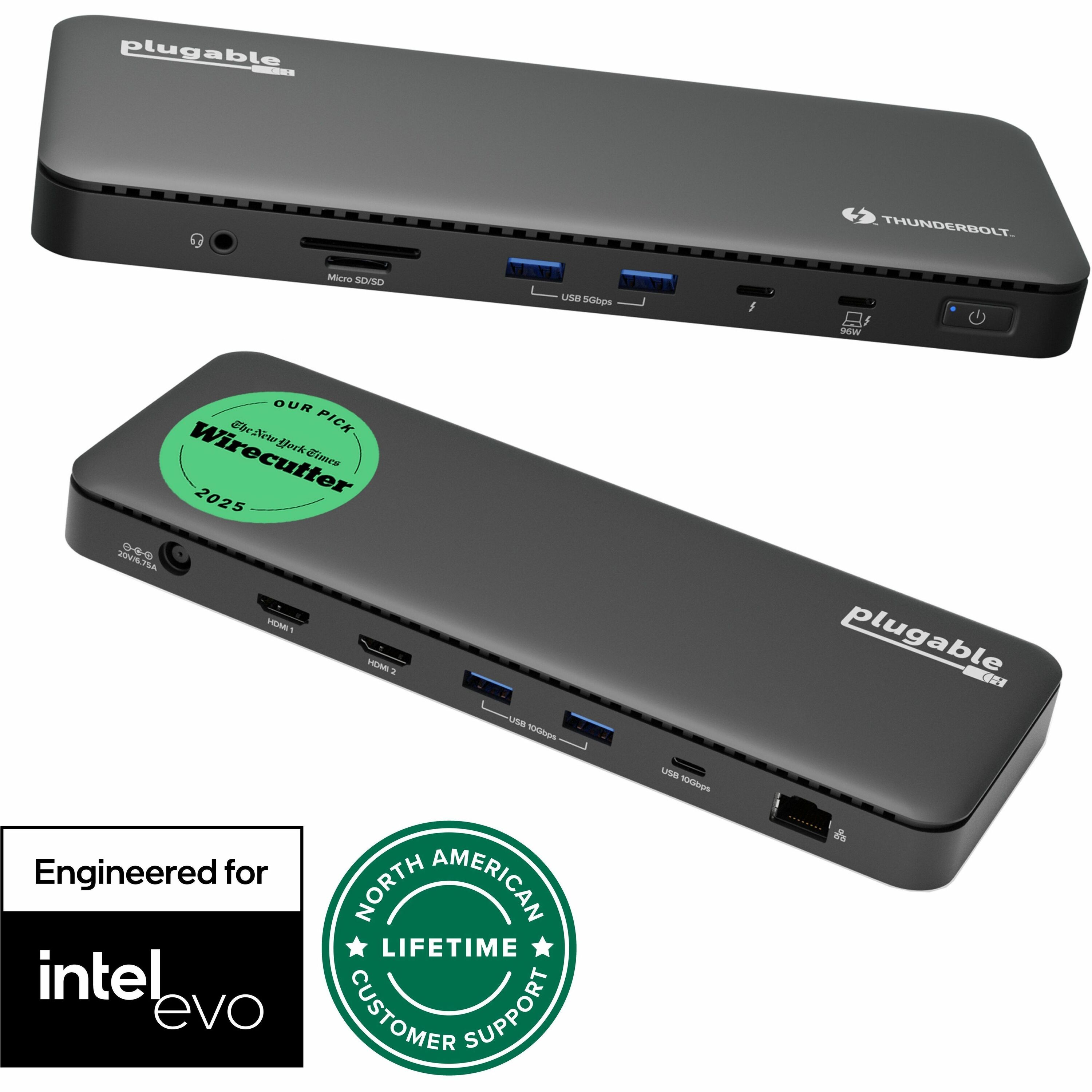 | Marketing Information | A "do-it-all" dock, the Thunderbolt Certified TBT4-UD5 Plugable Docking Station was awarded The Best Thunderbolt Docking Station by Wirecutter in 2025. It stands out as a versatile and powerful hub for modern workspaces. Its robust design includes an array of 13 ports, catering to a wide range of connectivity needs.Starting with the 40Gbps Thunderbolt 4 host port, this TB4 dock offers plenty of bandwidth to support two HDMI ports, each capable of driving dual 4K 60Hz displays. A downstream 40Gbps Thunderbolt 4 port is also included to provide high-speed connectivity for advanced Thunderbolt-based applications, such as fast storage devices. In addition to its display options, this Thunderbolt USB4 dock boasts a USB-C port with a 10Gbps transfer rate, ideal for quick file transfers and efficient data management. There are also 4x USB 3.0 ports (2x 10Gbps, 2x 5Gbps), perfect for connecting a variety of peripherals like keyboards, mice, and external drives. Throw in SD and Micro SD slots, a combo audio jack, Gigabit Ethernet, and a slot for a K lock, and this setup ensures that users can create a powerful and integrated workstation. Speaking of power, the TBT4-UD5 docking station Thunderbolt 4 packs it in with up to 100W Power Delivery (96W certified) - more than enough for most power-hungry laptops. Especially useful in business and education environments, the Plugable TBT4-UD5 Docking Station delivers exceptional functionality and convenience. |