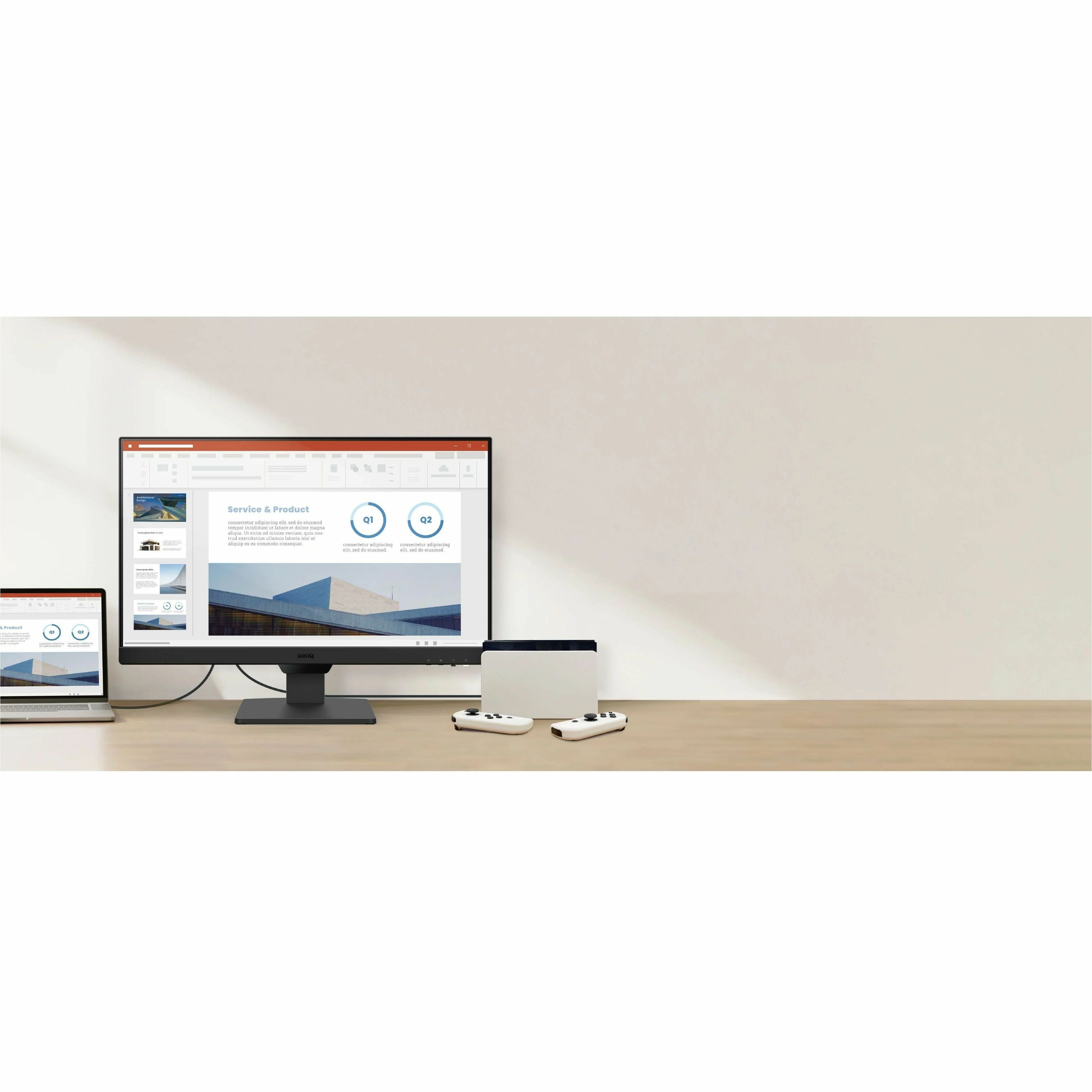 | Marketing Information | Effortless Display Transitions | Stay Linked to Your Daily Life Stay effortlessly connected to your daily devices, with multiple ports for ultimate convenience. Switch between all your display needs with seamless efficiency. Switch Seamlessly with One Click Conveniently placed buttons make switching between activities a breeze, streamlining your journey from every input source for your preferred setup. Seamless Viewing: 100Hz Smooth Motion 100Hz refresh rate reacts more quickly to changes, resulting in a clearer and smoother user experience with eye comfort for webpage reading, video streaming, or gaming, etc. VESA Certified MediaSync Guarantees VESA Certified MediaSync guarantees jitter-free playback, supporting all international broadcast video formats for an optimal multimedia experience. Coding | Color Modes for Multitasking Coding Mode is designed to make every color stand out for easy readability with optimized contrast and saturation of dark mode. Reading | Color Modes for Multitasking ePaper Mode, the simulated e-book display, balances the text and background to make long reading sessions easier on the eyes. Lasting Well-Being on Your Eyes During long usage from day to night, the Brightness Intelligence sensor detects light changes in your viewing environment and actively adjusts the screen brightness for a comfortable viewing experience. B.I. Gen2 allows for a higher degree of adjustability with customizable screen brightness to adjust to your preferences while caring for your eyes. Brightness Intelligence Technology The Brightness Intelligence Technology (B.I.Tech.) detects content intensity to avoid overexposure of bright scenes while enhancing dark areas to maintain clear visibility. The display performance is ideal for both work and fun, protecting your vision with superb imagery quality. Low Blue Light Plus Technology This technology maintains vivid colors while filtering out shorter, higher energy blue-violet radiation that is harmful to the eyes Flicker-Free Technology The exclusive BenQ Flicker-Free Technology eliminates flickering at all brightness levels to reduce eye strain, fatigue, and headaches. Color Weakness Mode The red and green filters on the monitor help individuals with color deficiency distinguish colors more easily. ePaper Mode The simulated e-book effect with clear black and white reading layout provides a better reading experience. TÜV Rheinland Certified Global safety authority, TÜV Rheinland, certified the GW2490's Flicker-Free and Low Blue Light Technology as truly friendly to the human eye. Eyesafe 2.0 certification ensures that the display reduces blue light while maintaining vivid colors. Eye-CareU Leave it to the compatible software of Eye-CareU on the GW2490 to set timers, light reminders, and distance reminders to correct your posture as you focus on what you do best. The pop-up works as an assistant, allowing for quick navigation and settings via its quick on-screen control. |
