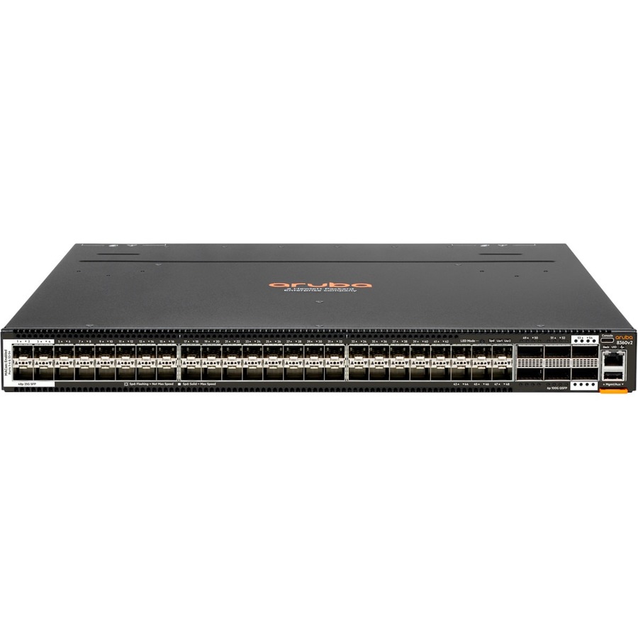 | Marketing Information | Aruba CX 8360 v2 Switch Series The Aruba CX 8360v2 Switch Series offers a flexible and innovative approach to addressing the application, security, and scalability demands of the mobile, cloud, and IoT era. These switches serve the needs of the next-generation core and aggregation layer of campuses, as well as virtual and highly dynamic data center environments. They provide up to 4.8Tbps of capacity, with line-rate Gigabit Ethernet interfaces including support for Smart Rate (1/2.5, 5 Gbps), 10Gbps, 25Gbps, 40Gbps, 50Gbps, and 100Gbps. The 8360v2 series includes industry-leading line rate ports with 1/10/25/50GbE (SFP/SFP+/SFP28) and 40/100 GbE (QSFP+/QSFP28) connectivity in a compact 1U form factor. 4x10Gbps and 4x25Gbps break out from 40/100G ports offer advanced flexibility in connectivity and aggregation. These switches deliver a fantastic investment for customers wanting to migrate from older 1GbE/10GbE to faster 25GbE, or from 10GbE/40GbE uplinks to 50/100GbE ports. In addition, the switch supports low- density MACsec ports enabling secure connectivity at 10GbE and 25GbE over unsecured domains. Key Features - High-performance 4.8Tbps and 2,678 Mpps