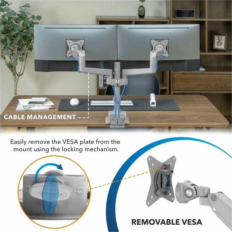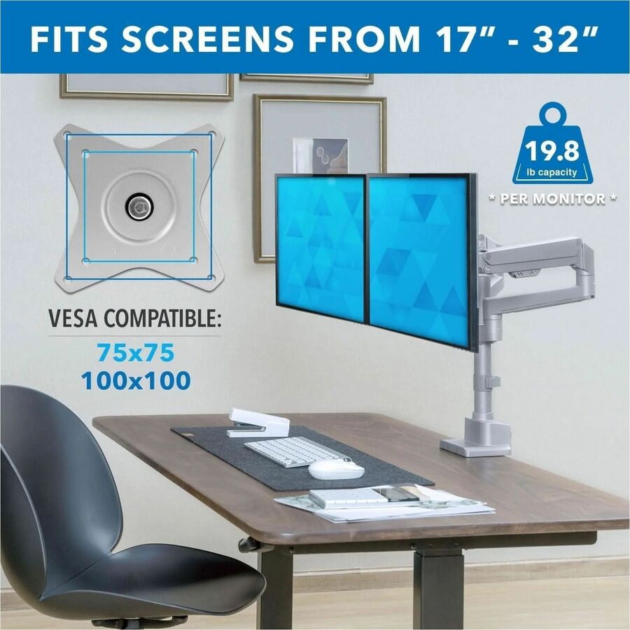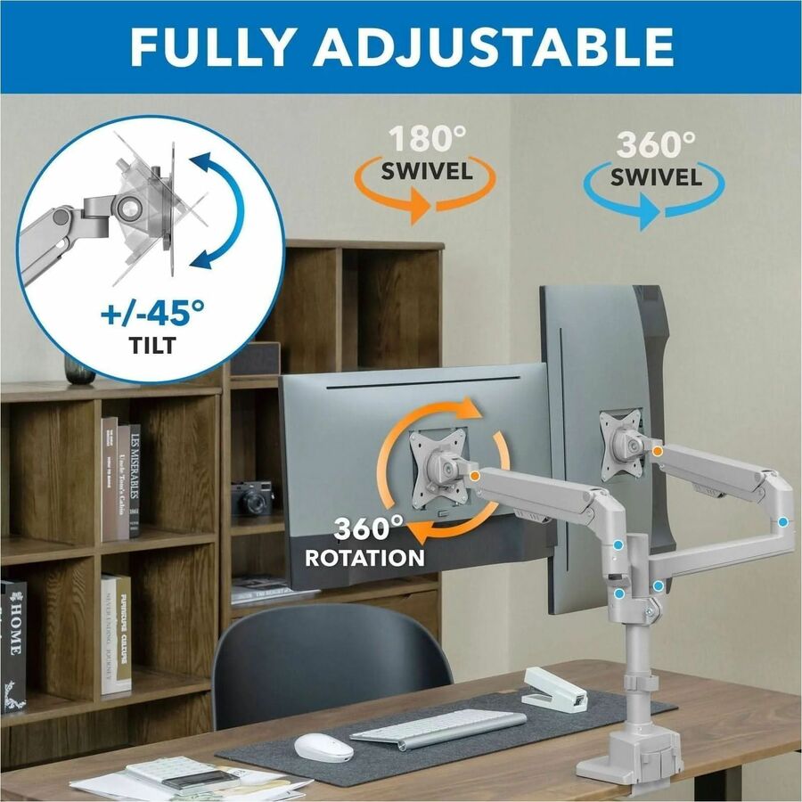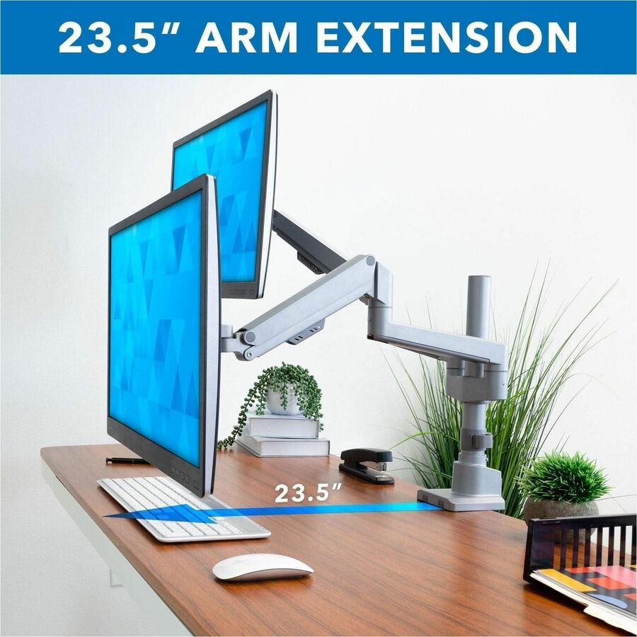 | Marketing Information | Create a healthier workspace with this Full Motion Dual Monitor Desk Mount that can tilt, swivel, rotate, and move up and down. Gas spring arms creates effortless adjustability. Sturdy design allows monitors to be positioned in portrait or landscape mode. Silver finish is sleek and modern. Our monitor mount distinguishes itself from competition with multiple features to ease the installation such as top-mount base, modular arms and quick-disconnect VESA heads that allow you to install this mount within minutes. |
