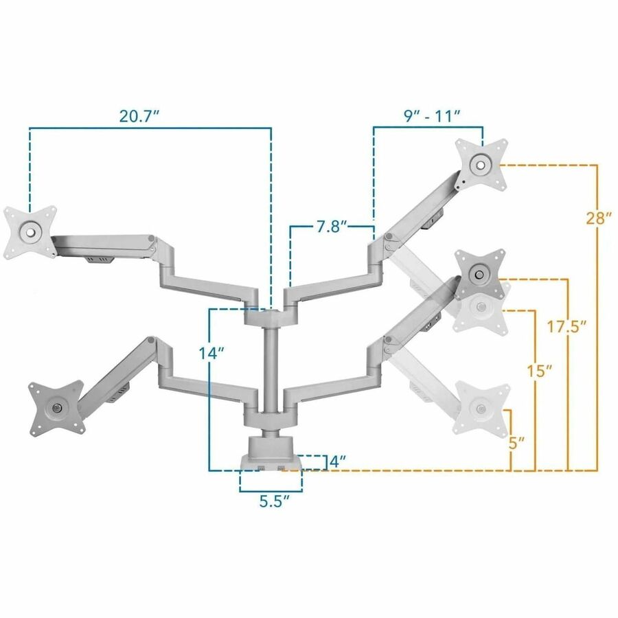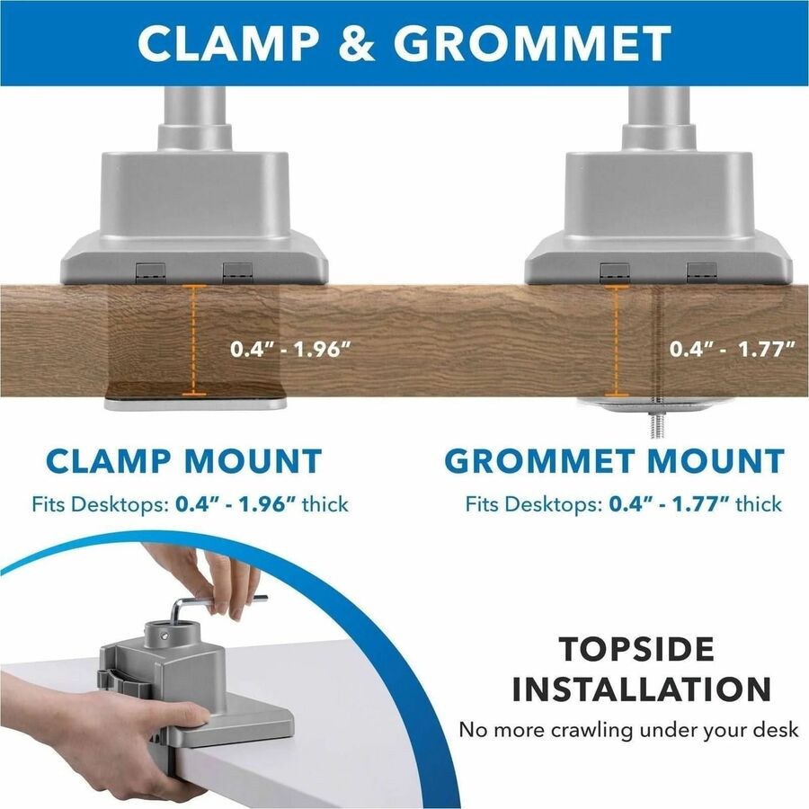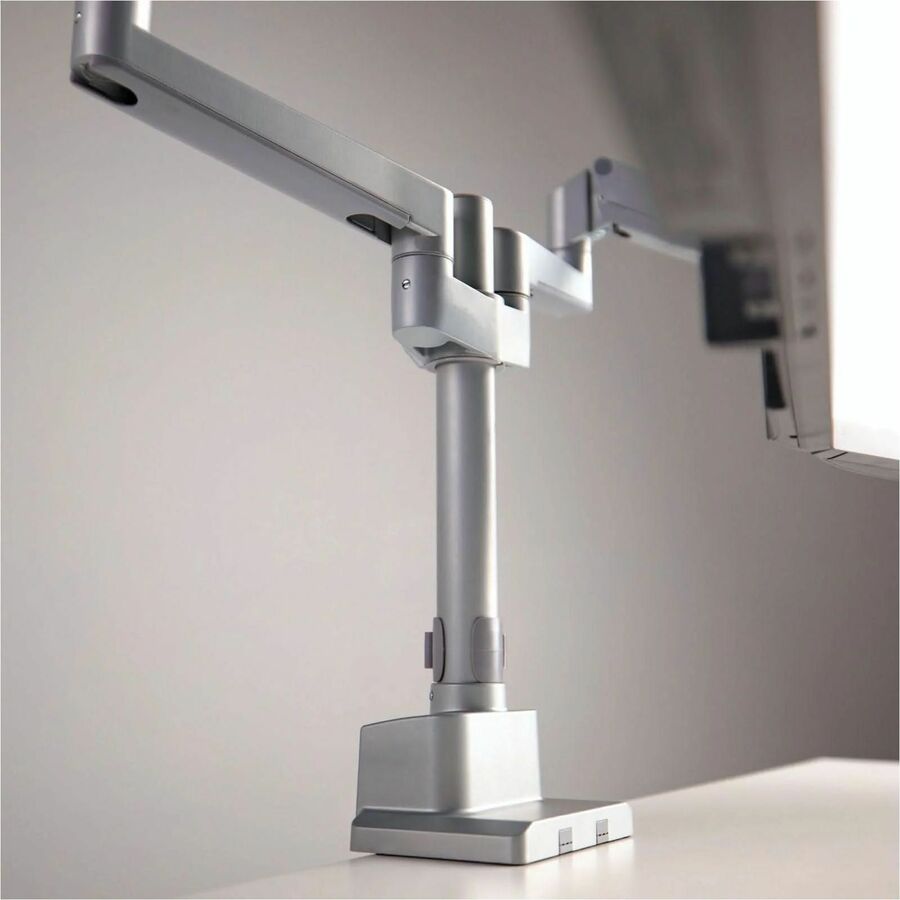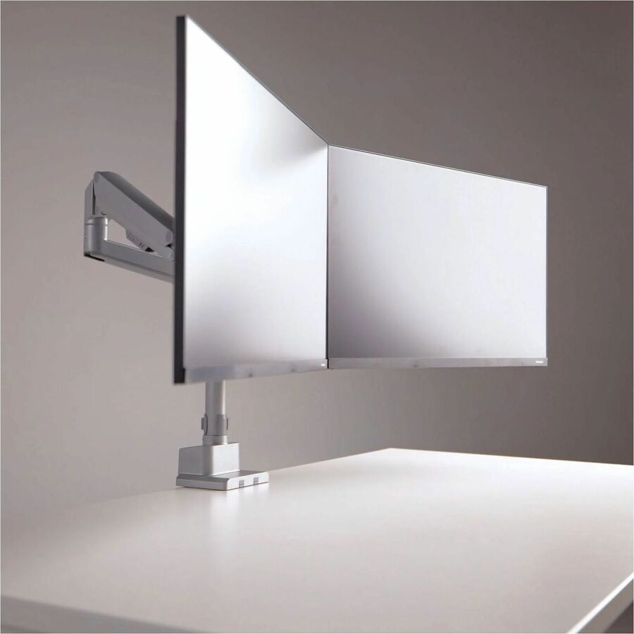 | Marketing Information | Create a healthier workspace with this Full Motion Dual Monitor Desk Mount that can tilt, swivel, rotate, and move up and down. Gas spring arms creates effortless adjustability. Sturdy design allows monitors to be positioned in portrait or landscape mode. Silver finish is sleek and modern. Our monitor mount distinguishes itself from competition with multiple features to ease the installation such as top-mount base, modular arms and quick-disconnect VESA heads that allow you to install this mount within minutes. |