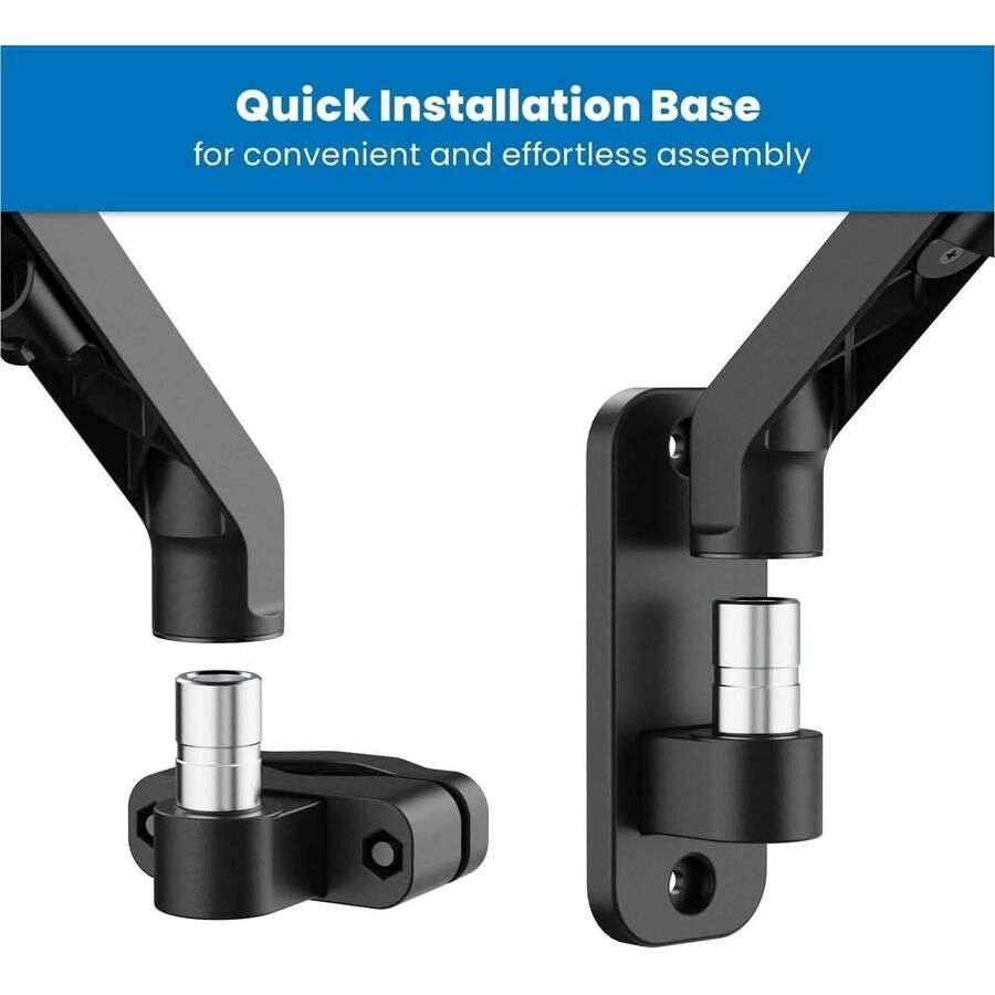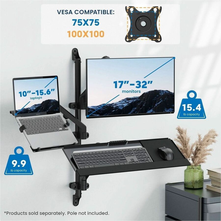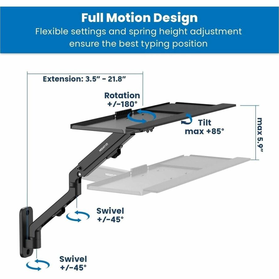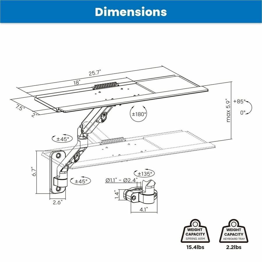 | Marketing Information | Whether you are using your keyboard in a medical office, a distribution center or for gaming at home, this flexible keyboard arm is your perfect solution to create a sleek floating workstation. With its spring-assisted arm, you can effortlessly raise or lower your keyboard to your desired typing position, ensuring optimal comfort and productivity. With the flexibility to choose between mounting the arm to the wall or an existing pole, you can customize your workspace to fit your needs. The spacious keyboard platform offers a 90° swivel, 21.8" maximum extension, and up to 85° tilt, allowing you to adjust your keyboard to your preferred angle for comfortable typing or move it our of the way when not in use. The integrated cable management system keeps your cords organized along the arm, reducing clutter and maintaining a clean workspace. It is the perfect addition to a monitor wall mount or monitor pole mount (sold separately) to complete your ergonomic workstation. This versatile arm can also be used as a wall or pole mounted monitor arm by simply removing the keyboard tray. With all the necessary hardware and instructions included, setting up your new workstation is a hassle-free experience. |