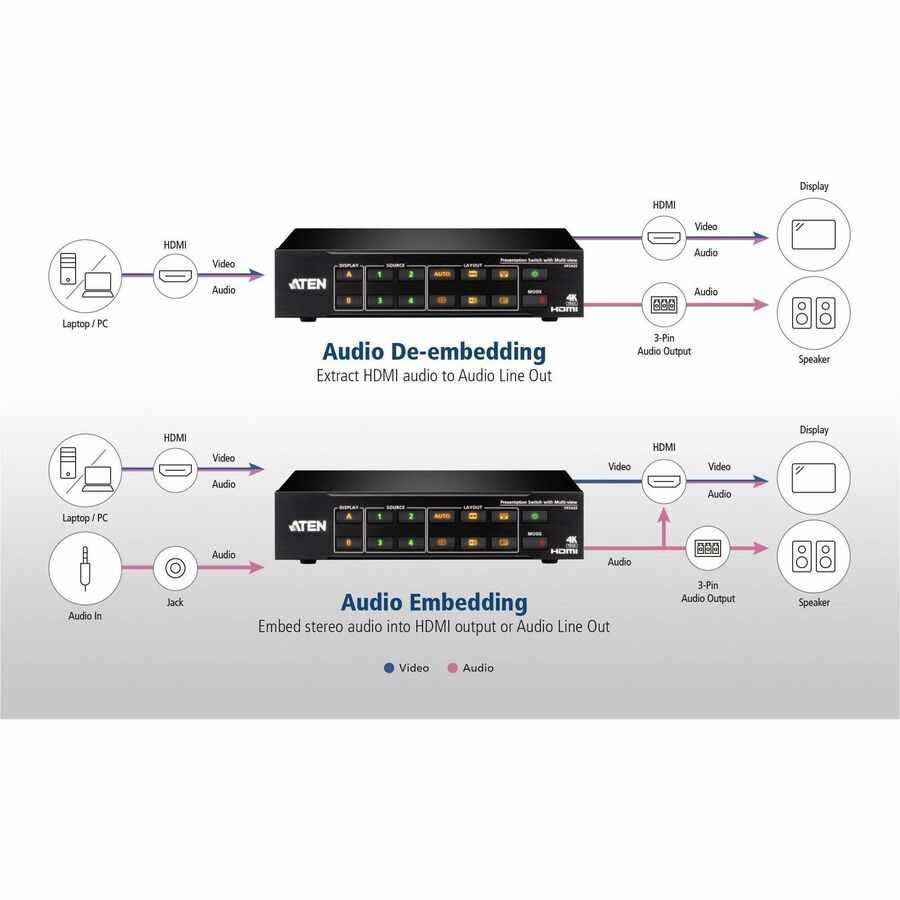| Marketing Information | Experience seamless collaboration and efficient decision-making with the ATEN VP2420 Presentation Switch, 4x2 True 4K HDMI Presentation Switch with Multi View. It delivers a stunning viewing experience across mixed resolution displays and ensures smooth switching between two screens with multiple sources. With multi-view functionality, it enables comprehensive data presentation, allowing participants to workshop ideas and compare information on a single screen. Its smart layout adjustment maintains a seamless flow as sources connect or disconnect, keeping meetings smooth and uninterrupted. The VP2420 supports versatile audio setups with options for audio embedding or separate extraction. Whether used standalone or integrated with control systems, it offers easy source control and future scalability with up to 4 presentation switches cascaded, making every presentation captivating, smooth, and efficient. Multi-View Display with Automatic Layout Adaptation Elevate your team collaboration and discussion with the VP2420, capable of displaying up to four video content sources on a single screen. This versatile setup facilitates side-by-side data comparison and the exchange of ideas among multiple participants, enhancing effective teamwork and decision-making. New video sources can be integrated into the existing layout anytime for a smooth and dynamic display experience. Visual Excellence with True 4K Clarity and Advanced Scaler Experience stunning True 4K/60 resolution with the VP2420, delivering exquisite details and intricate visuals for an unparalleled viewing experience. Its advanced scaler seamlessly handles most-common input resolution up to True 4K or downscales to 1080p, offering a smooth and simultaneous display of mixed-resolution sources. Unlock Perspectives with Matrix Output on 2 Displays Beyond merely splitting sources across two screens, the VP2420 features two independent displays: one capable of handling up to four sources at once, and the other highlighting the content for disucssion. This setup provides a comprehensive view, ensuring focused and efficient discussions that accelerate the decision-making process. Six Preset Rapid Multi-View Layouts The VP2420 allows video content to be flexibly presented in six different multi-view layouts. It offers options such as quad, triple, picture-in-picture (PiP), picture-by-picture (PbP), and full screen, all of which can switch seamlessly within one second. This provides a dynamic and efficient display, meeting any presentation need. Audio Flexibility with Embedding and De-embedding Function The VP2420 enhances presentations with flexible audio options, allowing for separate audio track integration into video content (embedding) or extraction (de-embedding) of audio from the video signal for independent processing through amplifiers or speakers. Multiple Methods for Streamlined Presentation Management Managing presentations with the VP2420 is effortless, offering a wide range of control options such as front panel, push buttons, IR controllers, web GUI,mobile app , RS-232, and Ethernet. Integration with control systems further enhances control, providing a comprehensive and streamlined presentation experience. |