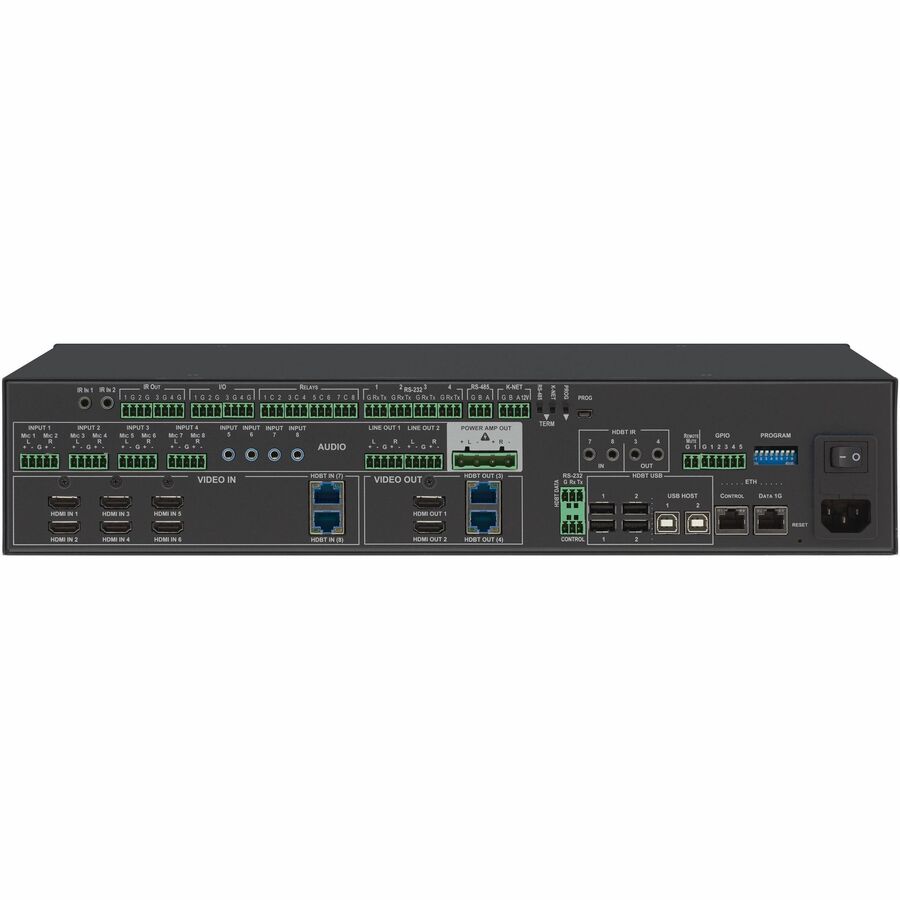 8 x Inputs - 4 x Outputs - Audio Line In - Audio Line Out - 6 x HDMI In - 2 x HDMI Out - USB - Network (RJ-45) - PC Compatible