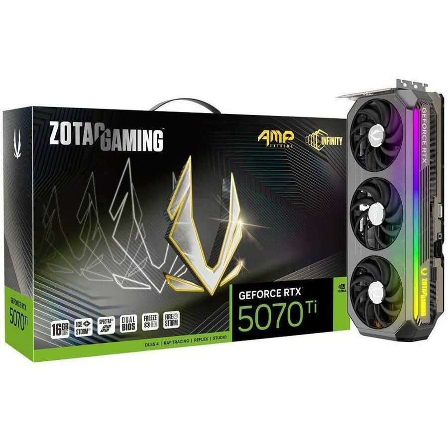 | Marketing Information | The ZOTAC GAMING GeForce RTX™ 5070 Ti AMP Extreme INFINITY offers a completely revamped gaming experience with a whole new approach to Graphics Card design, featuring NVIDIA's cutting-edge Blackwell architecture and features such as DLSS 4. With an elegant design punctuated by a gorgeous infinity mirror in the front, a reinforced mid-frame, and a vapor chamber larger than its predecessor, the AMP Extreme INFINITY gives you infinite possibilities for gaming, or applications beyond. Feature Highlights: - Powered by the NVIDIA Blackwell architecture and DLSS 4 - The ultimate ZOTAC GAMING GPU - Infinity Mirror Design - IceStorm 3.0 Advanced Cooling - Larger Vapor Chamber - BladeLink Fans - FREEZE Fan Stop, Active Fan Control, Dual BIOS - SPECTRA 2.0 RGB Lighting - SPECTRA LINK Lighting Sync port - Metal die-cast Backplate - Bundled with GPU Support Bracket - 12V-2x6 Safety Light - All-new FireStorm Utility REDEFINING GAMING AND STYLE ZOTAC reimagines one of the core essentials of a performance PC, as the centerpiece of an entire setup. Blending design, performance, and airflow dynamics, the ZOTAC GAMING GeForce RTX 50 series GPUs blur the line between tech and art. ELEGANT | DISTINGUISHED | UNRIVALED NVIDIA Blackwell Architecture The Ultimate Platform for Gamers and Creators Fifth-Gen Tensor Cores Max AI performance with FP4 and DLSS 4 New Streaming Multiprocessors Optimized for neural shaders Fourth-Gen Ray Tracing Cores Built for Mega Geometry AI-Enhanced Graphics and Performance NVIDIA DLSS 4 with Multi Frame Generation Game-Winning Responsiveness NVIDIA Reflex 2 with Frame Warp True-to-Life Graphics Full ray tracing with neural rendering Digital Humans and AI Assistants NVIDIA ACE Accelerate Your Creativity NVIDIA Studio creator tools and technology Enhance Any Video with AI NVIDIA Broadcast and ninth-gen NVIDIA Encoder Performance and Reliability NVIDIA app with Game Ready and Studio Drivers The Ultimate Gaming Display Technologies NVIDIA G-SYNC RTX. It's On. | The Ultimate in Ray Tracing and AI RTX is the most advanced platform for full ray tracing and neural rendering technologies that are revolutionizing the ways we play and create. Over 700 games and applications use RTX to deliver realistic graphics and incredibly fast performance with cutting-edge AI features like DLSS Multi Frame Generation. |