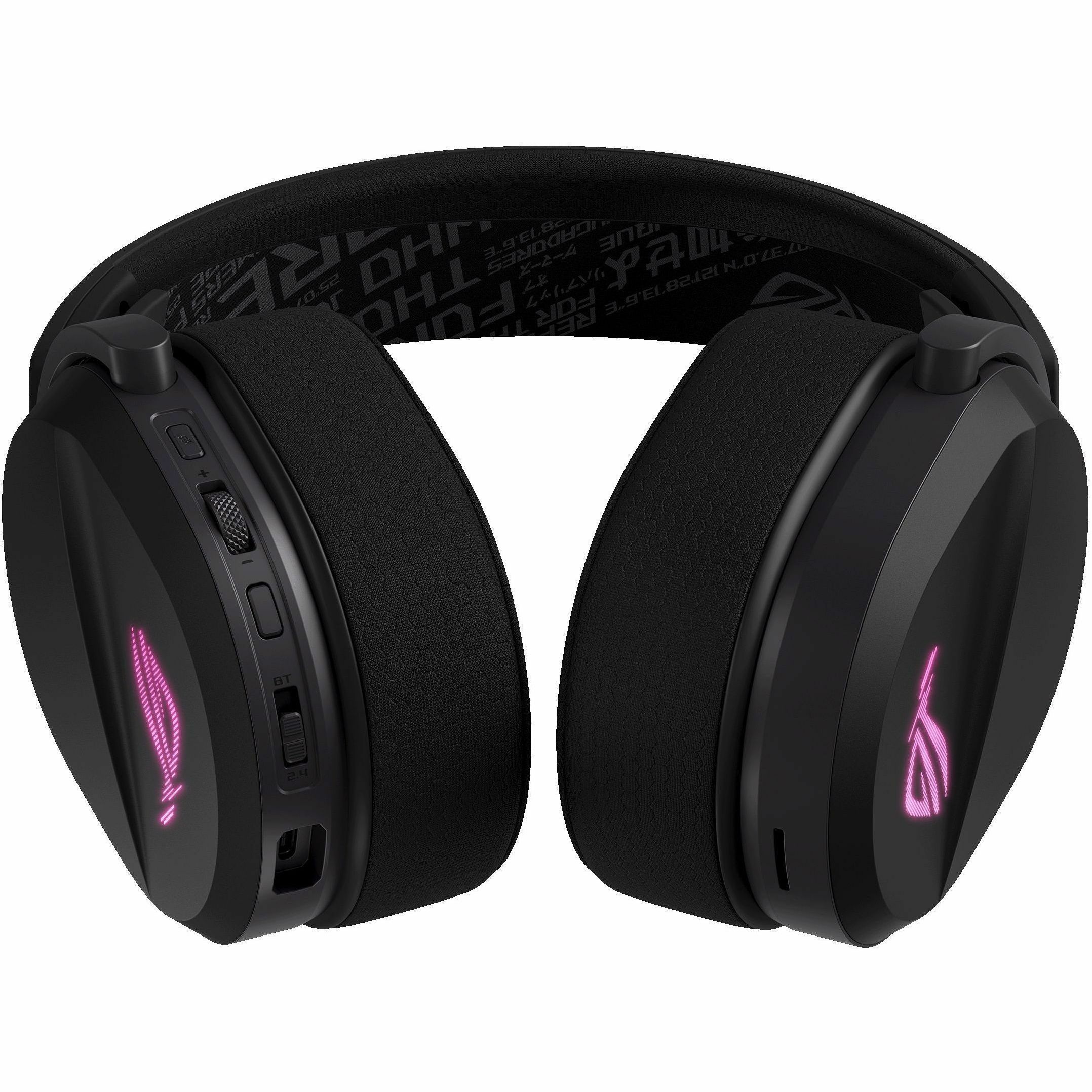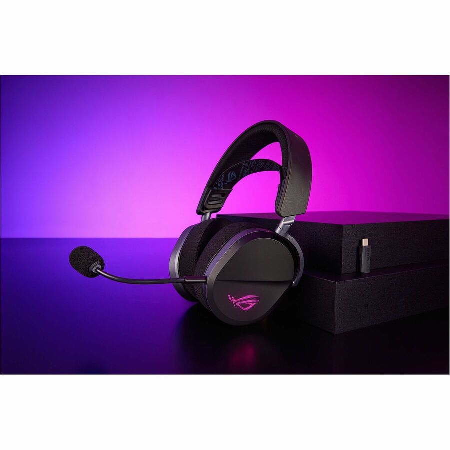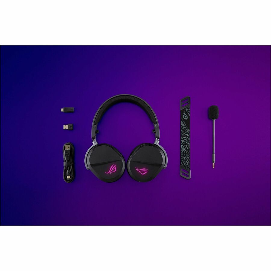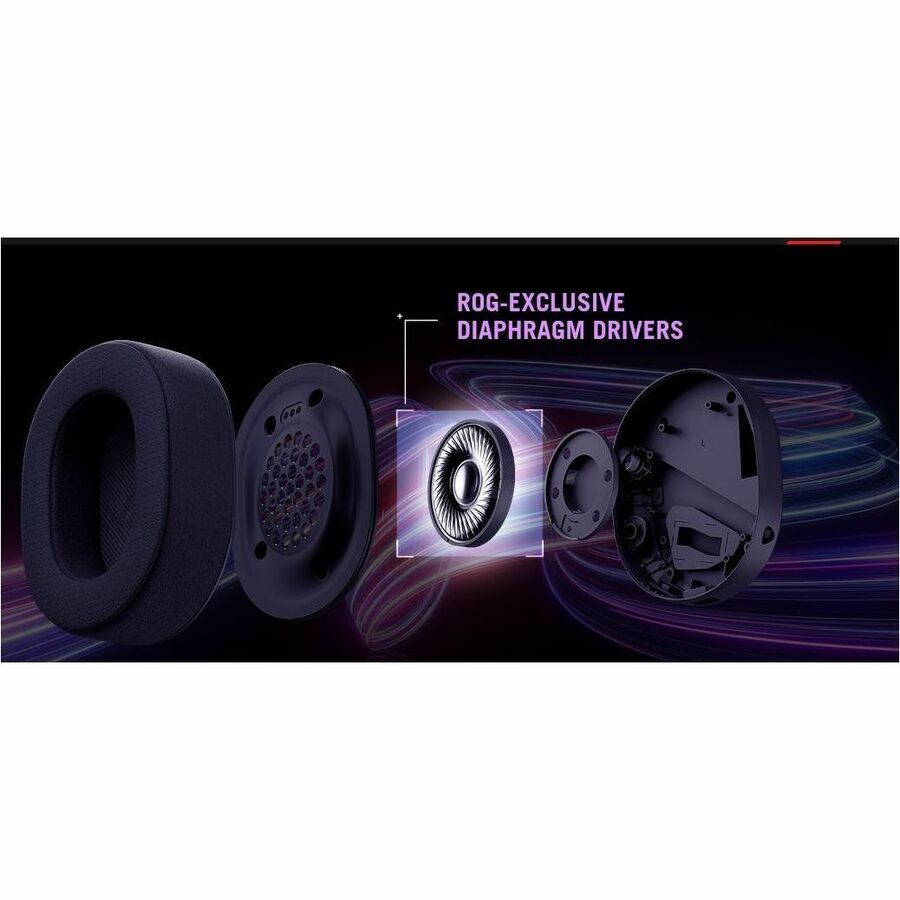 Tri-mode RGB gaming headset with ROG SpeedNova wireless technology, 50 mm ROG titanium-plated diaphragm drivers, refined wireless sound signature, 10 mm super-wideband boom microphone, lightweight 309-g design, plus ASUS Aura Sync RGB lighting