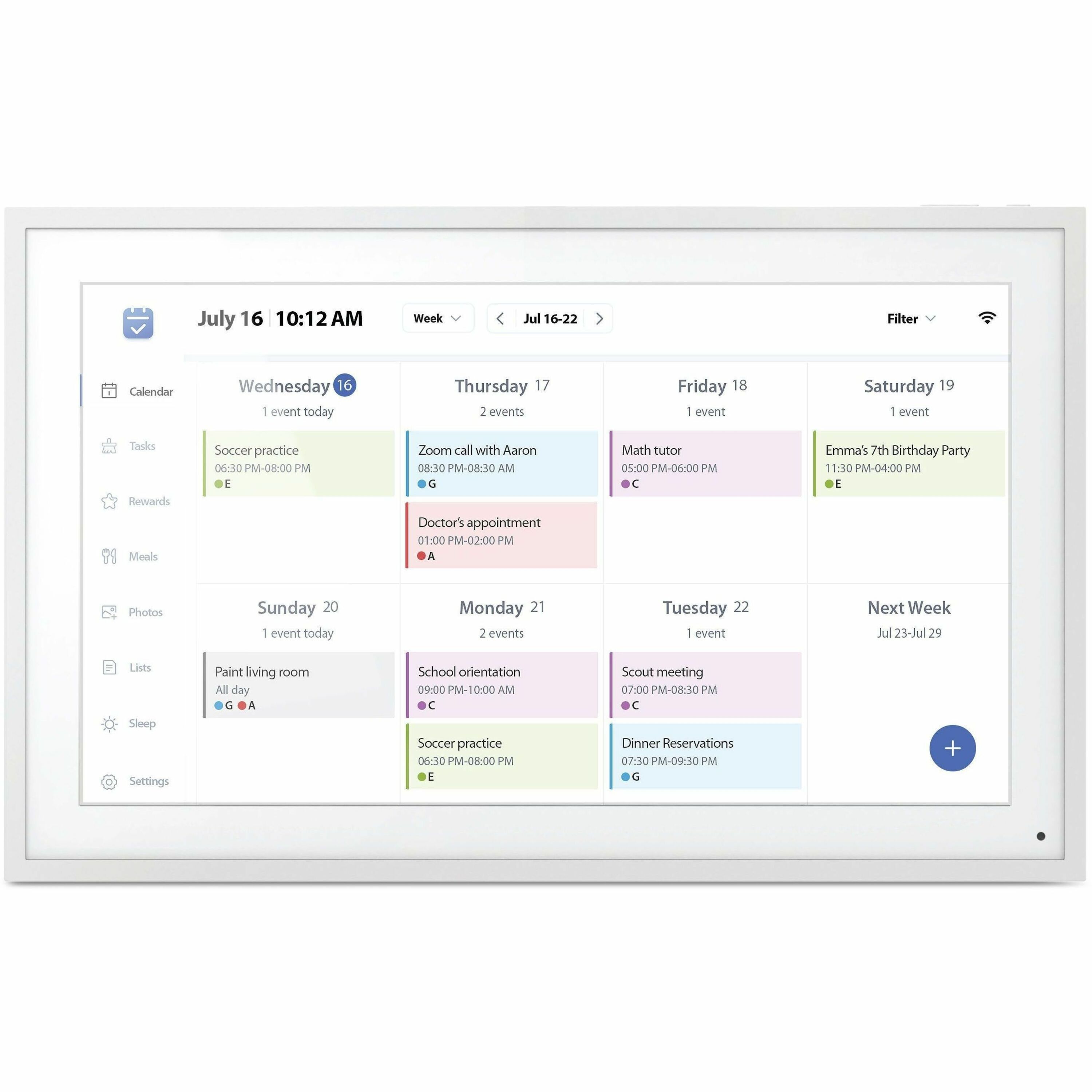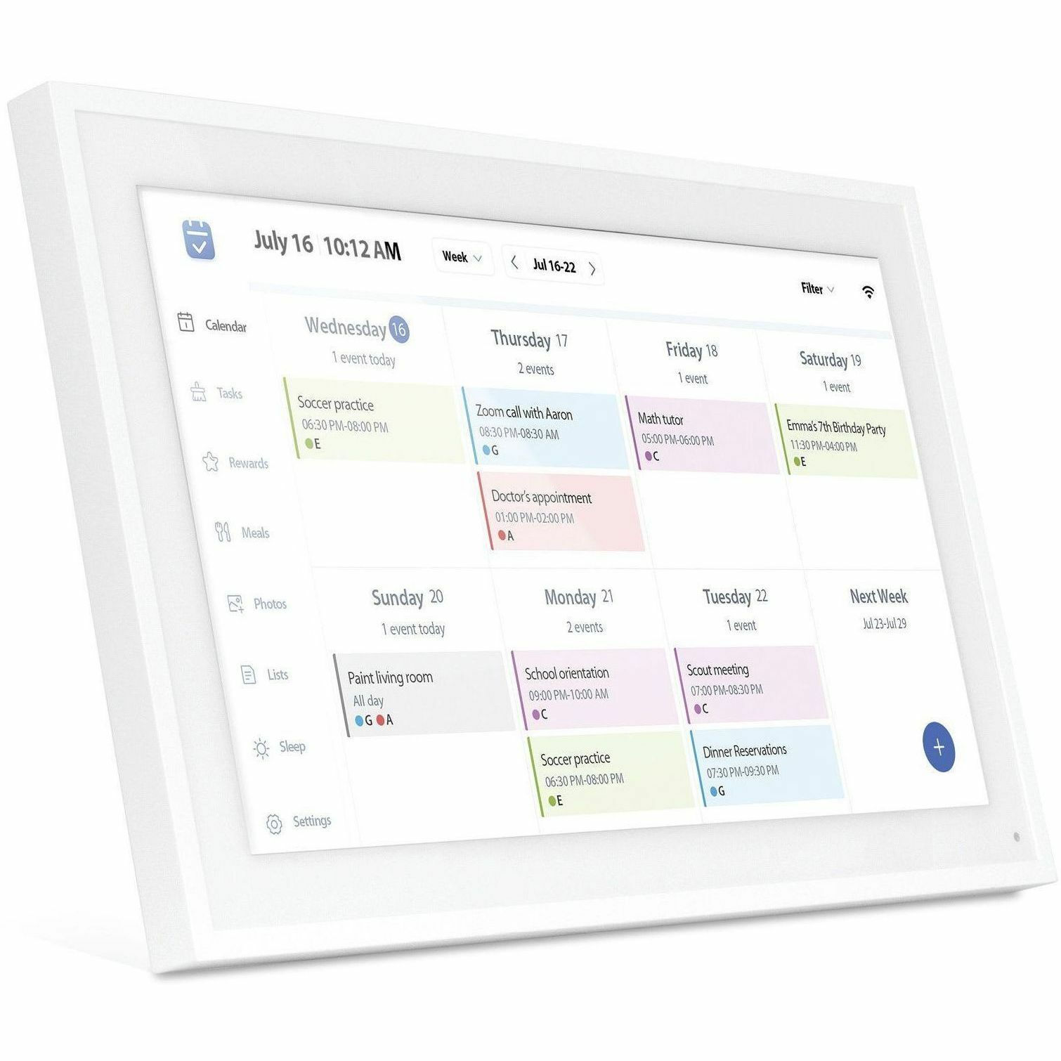 | Marketing Information | The 15.6" Smart WiFi Digital Calendar & Photo Frame is a valuable tool for managing your busy daily life. Sync your frame to your Google, Apple, Yahoo, Outlook or Cozi calendars to seamlessly consolidate everyone's schedules - all in one place with the help of the easy-to-use eCalendar smartphone app for iOS and Android. Create to-do lists, schedule chores, plan meals and more. Automated reminders help to keep all tasks on track and boosts productivity. In addition, easily share your photos and videos with incredible image clarity on the vibrant true color touchscreen IPS LCD panel in 1080p resolution at an ideal 16:9 aspect ratio. Display media in vertical or portrait mode with advanced settings that allow images to be viewed in full screen regardless of the frame's orientation. The frame features Dual Band 2.4/5 GHz for faster media delivery. Smart Family eScheduling Sync your Google, Apple, Yahoo, Outlook and Cozi calendars to the frame. With color-coded events, to-do lists, task and meal planning, this all-in-one tool simplifies scheduling for busy households. Wireless Photo and Video Sharing Easily share your photos and videos with incredible image clarity on the true color touchscreen IPS LCD panel in 1080p resolution at an ideal 16:9 aspect ratio. Features Dual Band 2.4/5 GHz for faster media delivery. Light Sensor Activated The digital photo frame has a built-in light sensor that helps save power usage by automatically powering on/off and adjusting the screen brightness based on the amount of light in the room. Auto Rotation The frame includes a removable stand so it can be viewed horizontally or vertically, or mounted to a wall. Photos and videos will automatically rotate to the frame's orientation. Advanced settings allow media to be viewed in full screen regardless of the frame's orientation. Smartphone App Functionality For use with our eCalendar app for download on iOS / Android devices. Select photos and videos to display, sync your calendar, create tasks, schedule events and more - right from the app. |
