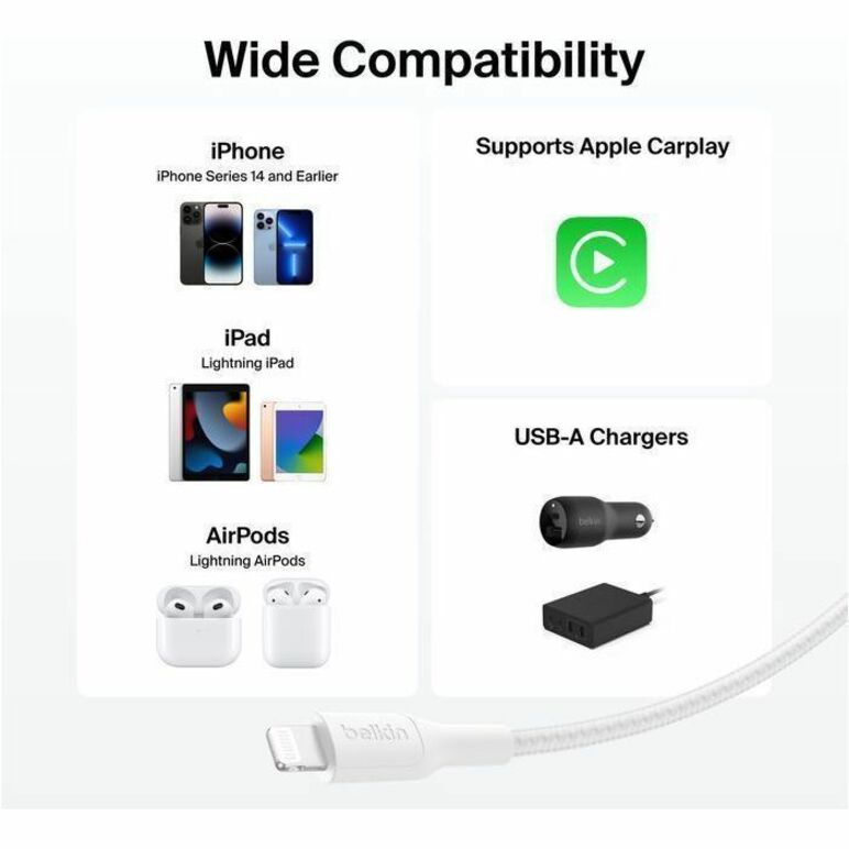 | Marketing Information | Fast, durable and responsibly made, this braided USB-A to Lightning cable is made from recycled materials, charges an iPhone 14 up to 50% in just 45 mins, and comes in a range of sizes-perfect for when you need a quick boost at home or on-the-go. |