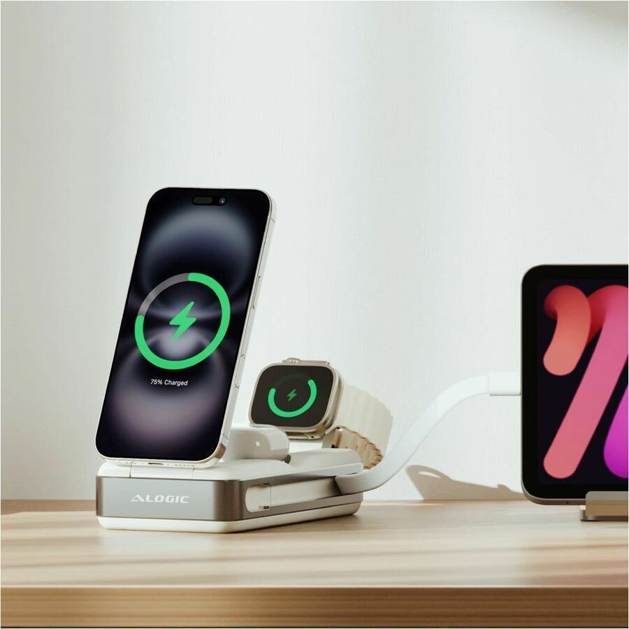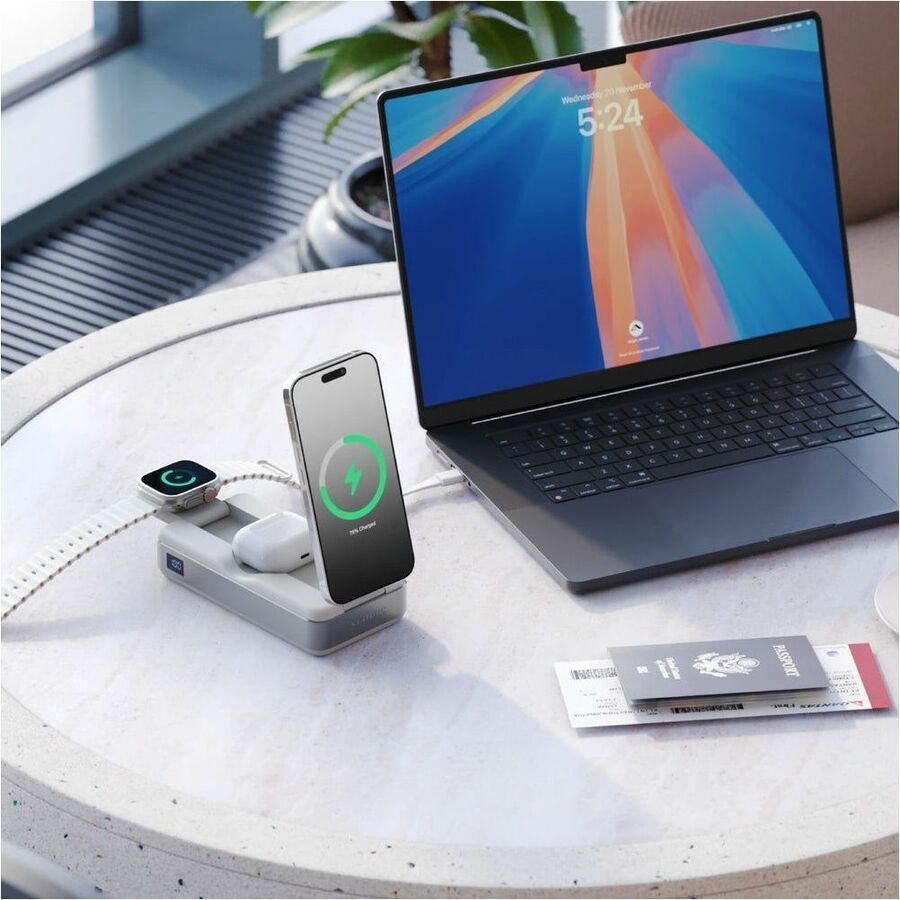 | Marketing Information | Power Your Next Adventure with Roam | The Sky's the Limit With Roam's long-lasting 21,000mAh battery in your carry-on, you won't have to worry about your devices running flat on even the longest flights. Powers Everything That Matters Designed to charge everything you travel with, Roam combines three versatile USB-C charging options with fast wireless charging for everything you carry. Six Charging Options 100W USB-C Port 100W USB-C Cable 18W USB-C Port 15W Qi2 Wireless Charging 5W Qi Wireless Charger Apple Watch Charger The All-at-Once Charger Roam can fast charge your phone, earbuds and Apple Watch while still recharging your laptop. Perfectly Portable Roam makes travel easy with its cornerless, fold-up design and impossible to lose USB-C cable. Works with MagSafe iPhones Multi Charging Next-Gen Wireless Charging Battery Indicator Permitted on Airplanes Superior Safety Snap-on Phone Stand Roam can fast charge your phone, earbuds and Apple Watch while still recharging your laptop. Snap-on Apple Watch Charging Roam's fold-out Apple Watch charger makes it easy to give your watch a quick boost before a work out, or recharge overnight. |
