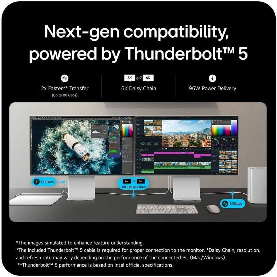 | Marketing Information | 6K with 224ppi. A wider workspace, clarity in detail The 6K display (6144×3456, 224ppi) offers up to 156% more pixels than standard 4K UHD (3840×2160), providing additional on-screen space to manage multiple tasks at once. You can work with full 4K files in their original resolution while still having additional workspace for timelines, toolbars, and other creative tools. Its ultra-high 224ppi (pixels per inch) delivers near-original clarity and pinpoint detail, ensuring greater accuracy for professional creators. Professional display. | Professional performance. A high-performance display tailored for demanding professional workflows, delivering precise colour accuracy, expansive visual space, and seamless compatibility to support video editors, photographers, 3D artists, AI creators, and web designers while maximizing productivity across every task. Next-gen compatibility, powered by Thunderbolt™ 5 Elevate your workflow with Thunderbolt™ 5 on 6K displays. Thunderbolt™ 5 ensures next-gen compatibility, supporting key workflows seamlessly with 2x Faster Transfer, 6K Daisy Chain and DisplayPort 2.1 bandwidth. For creators, editors and AI artists, it empowers effortless connectivity and multitasking with robust performance and scalability. Plus, 96W Power Delivery supports fast, reliable charging for enhanced productivity. It's everything you need to bridge a future-ready workflow with maximum efficiency. Full port selection for a powerful hub works with both Mac computers and PCs Compatible with Mac computers and PCs, LG UltraFine evo 6K monitor lets you connect freely to a full range of devices through its complete port selection, turning it into a powerful hub. Every colour nuance, fully realized VESA DisplayHDR™ 600 offers bright highlights, deep shadows, and accurate colour representation for creative professionals. It enhances textures, elements, and natural interplay of light and shadow. Professional colour mastery, pixel by pixel Brings Adobe RGB 99.5% and DCI-P3 98% (Typ.) coverage, offering a wider and more accurate colour range than standard sRGB displays. Real 10-bit depth captures every shade with smooth, seamless transitions, making it ideal for HDR and high-resolution creative work that demands precision. 2000:1 deeper black and rich shadows Because contrast ratio impacts accurate coluor representation, Nano IPS Black enhances the contrast ratio from the standard IPS 1000:1 to 2000:1 delivering vibrant colours and sharper detail in objects, shadows, and backgrounds. Experience deeper blacks and richer shadows that remain consistent colour expression on the screen from edge to edge, and a heightened sense of realism that conveys your visual outputs naturally. Eye comfort, certified by TÜV Rheinland With TÜV Rheinland Eye Comfort certification, UltraFine evo 6K helps reduce blue light to provide a comfortable viewing experience without eye strain, even during long hours of work or media consumption. |