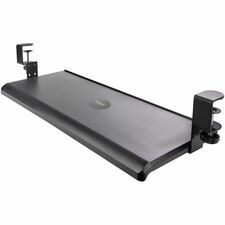 Sliding keyboard tray offers 3 heights (3.9/4.7/5.5in) - This black keyboard drawer extends up to 8.5" and the front is curved for comfort - The Clamp-on keyboard tray supports up to 26.5lb - The under desk keyboard tray area is 27.5x12.2in